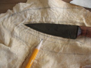When the rawhide is dry, lay your knife down on it and draw a line that is about a half inch out from the blade of the knife. If you want the handle to go part way down into the sheath, draw the lines on up about an inch and a half above where the blade begins. Pictured below: Rawhide with line drawn around blade.
