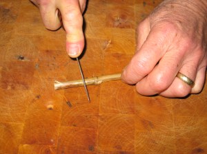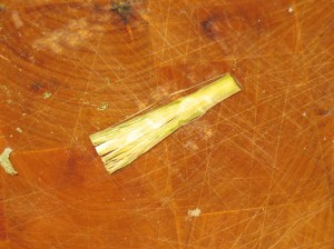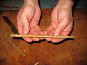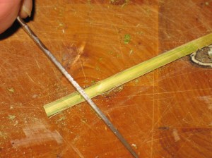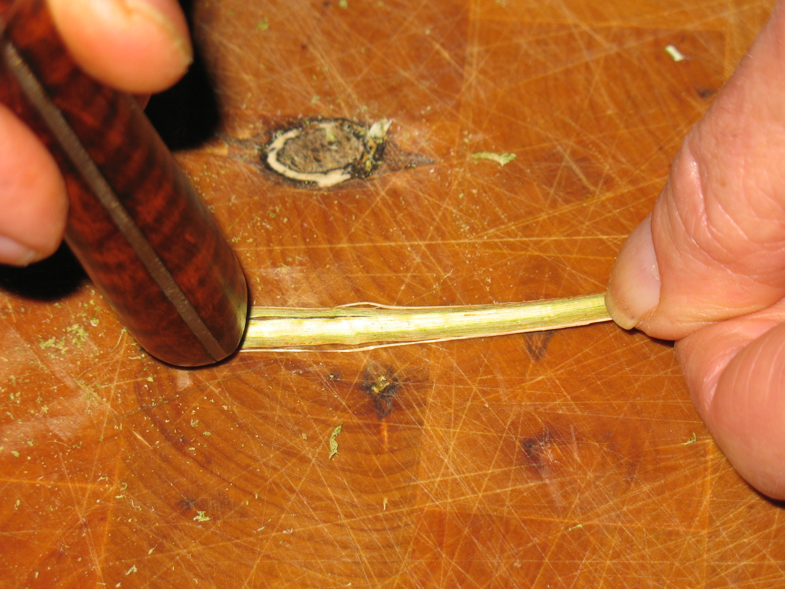To make a brush, take a piece of cane that is about three-eights of an inch in diameter and cut it about eight inches long. Make sure that a cane joint is about three-eights of an inch from one end of the handle. Pictured below: top, cutting the cane; bottom, finished handle.