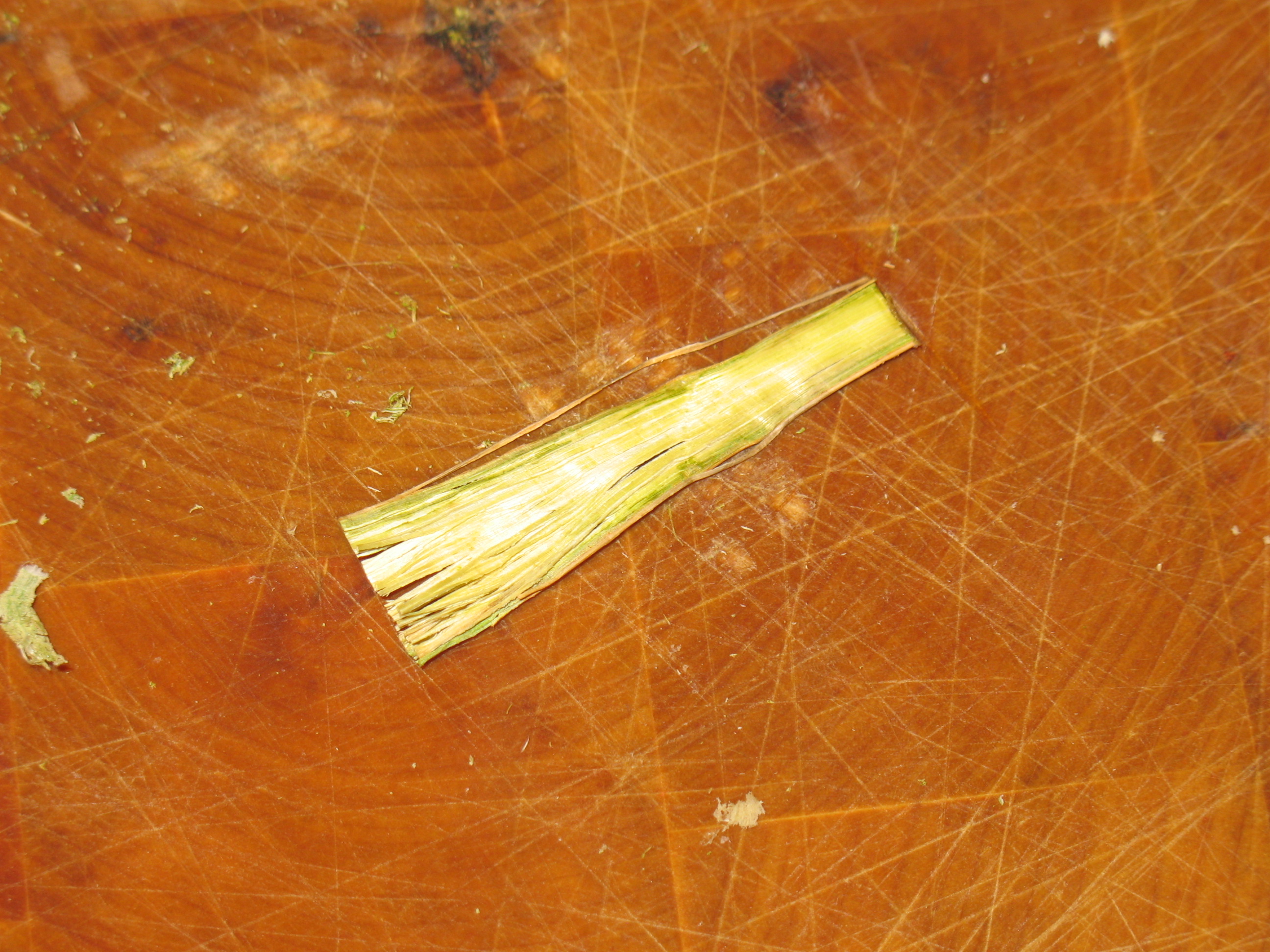 Now take your dried yucca leaf and peal of the outer membrane to expose the fibers. Use the butt of your knife handle to pound the fibers and separate them. Cut two or three sections of fibers about an inch long. Pictured below: top, scraping yucca leaf; middle, pounding leaf fibers; bottom, one finished fiber bundle.