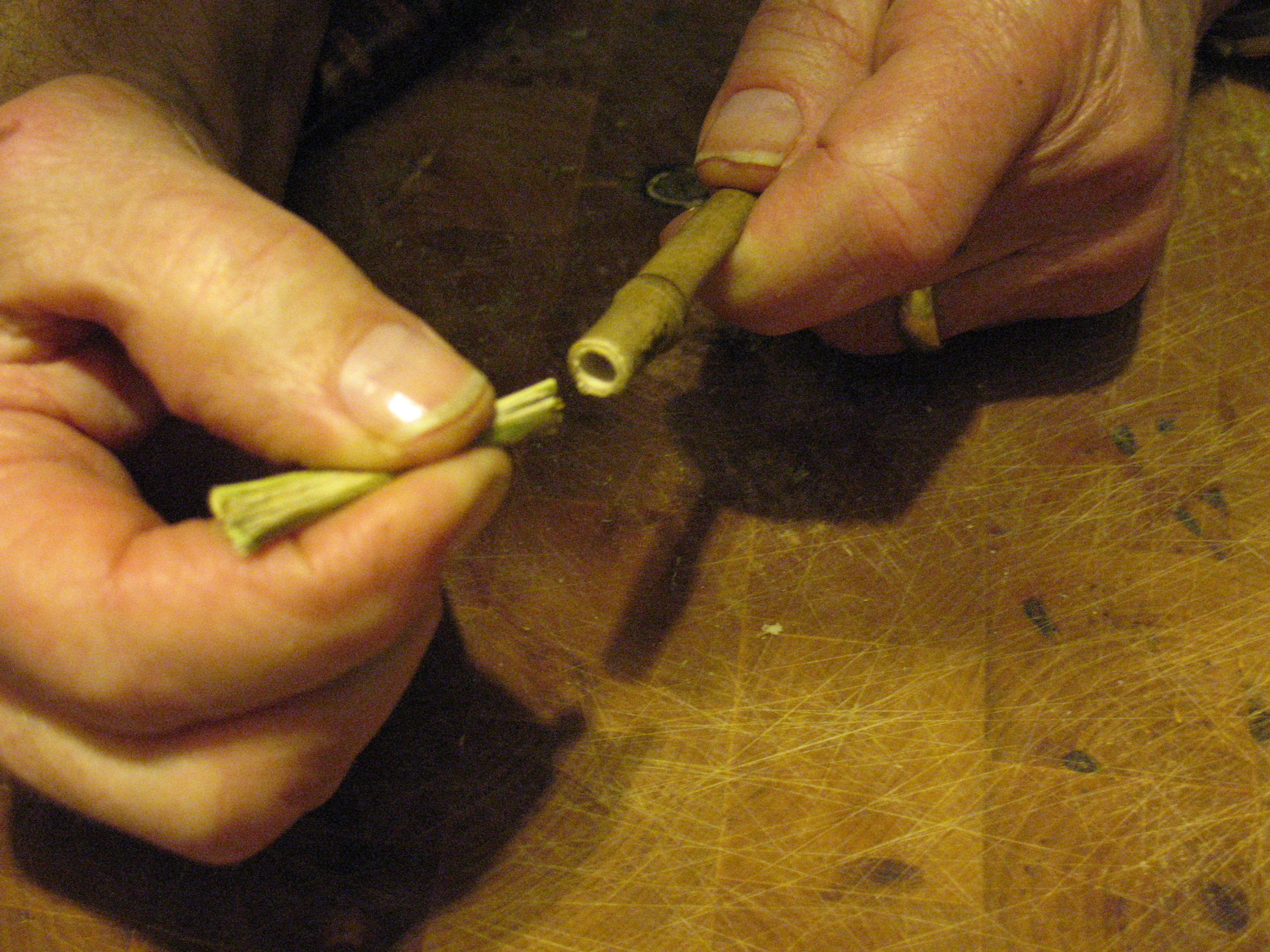Check to see if you have enough fibers before you try to glue them in, then warm your pine sap and drop a little into the end of the cane. Pictured below: top, checking the fit; bottom, putting pitch in the cane.