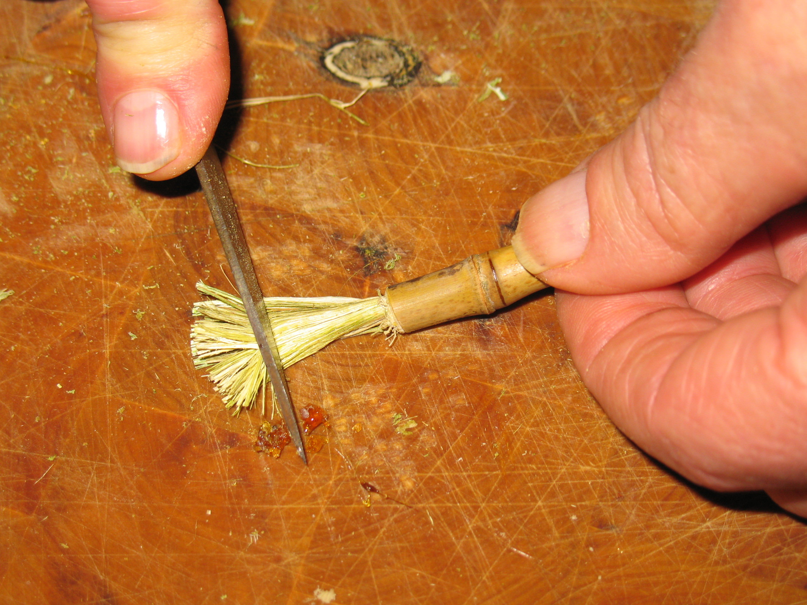 Quickly, before the sap hardens, push the yucca fibers down into the cane. Pictured below: top, cutting bristles to length; bottom, finished brush.