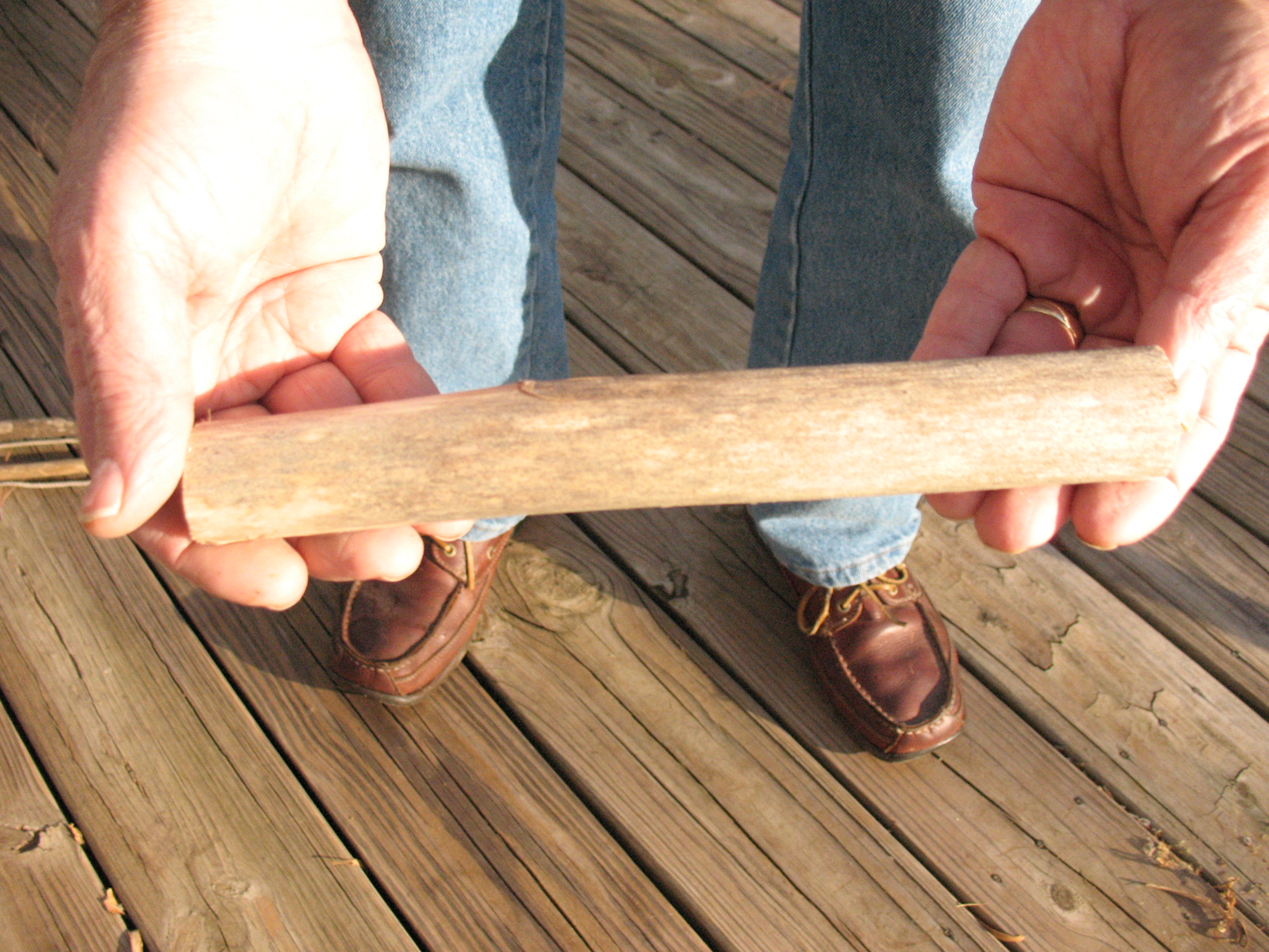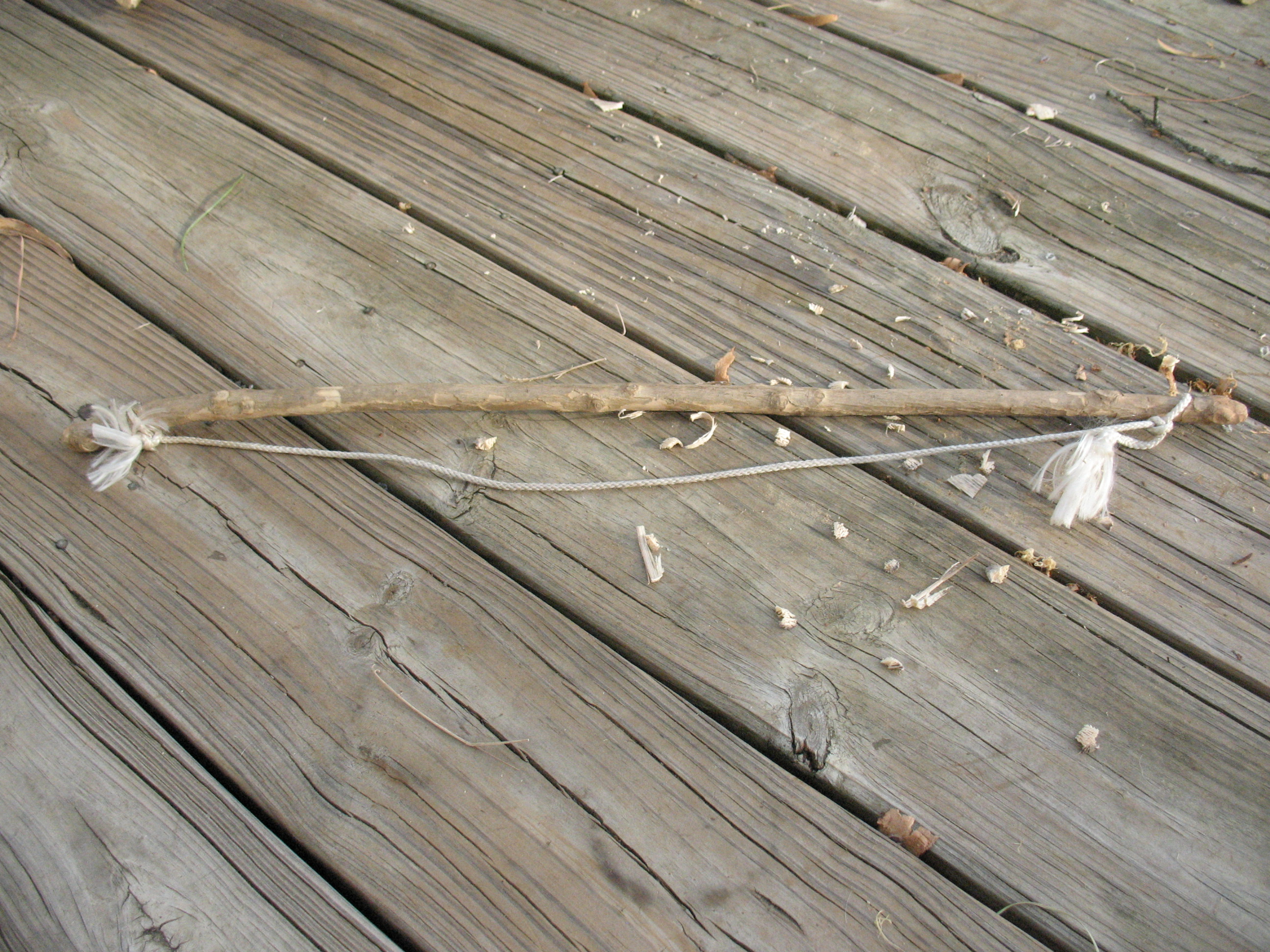 To make a spindle cut a stick about 3/4″ in diameter by ten inches long.  Round one end of the stick and carve the other end to a shallow point.  Do not smooth the stick off.  A rough surface will grip the bowstring better when you are turning the spindle.  Pictured below: The spindle.