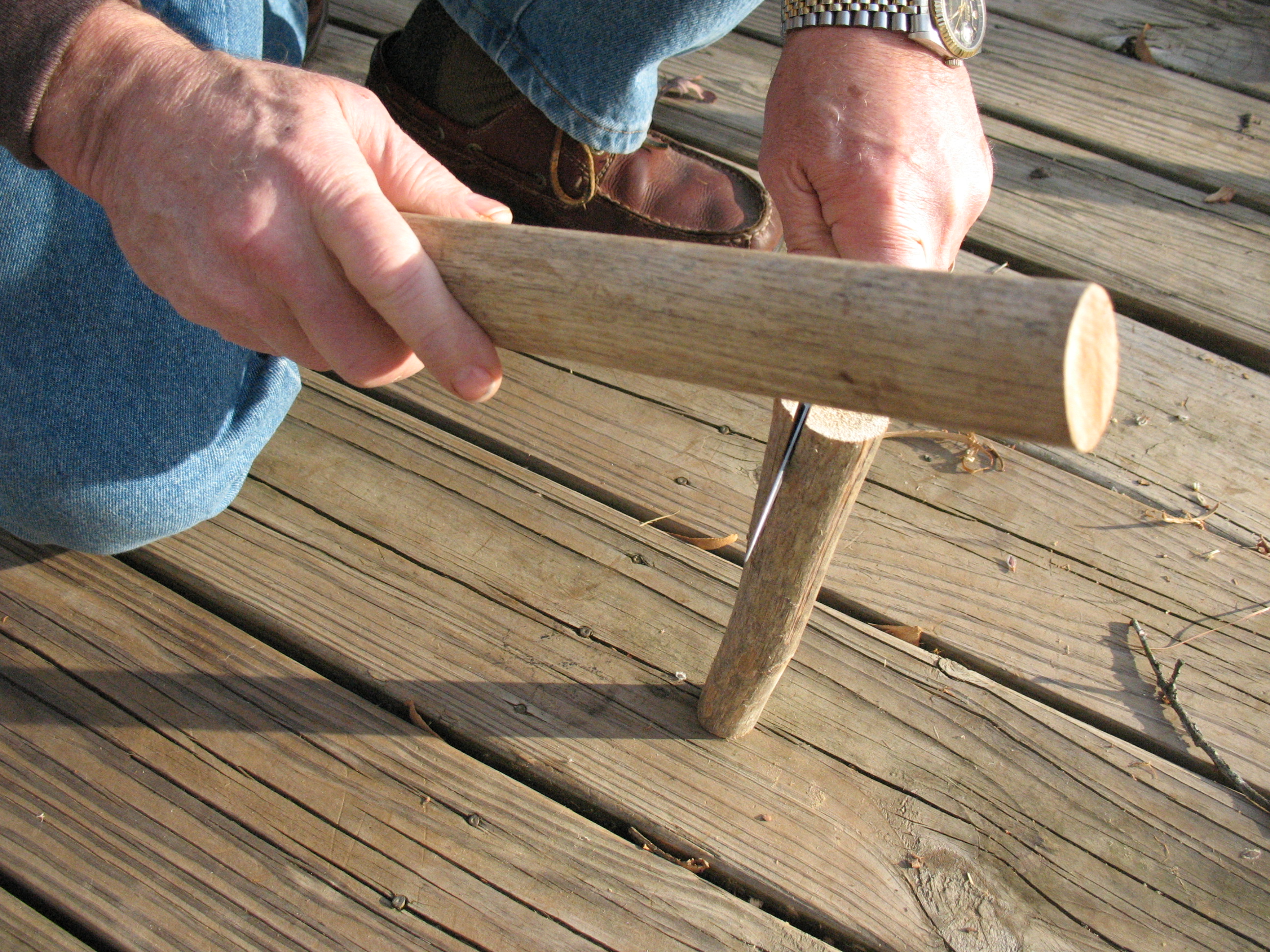 BOW – The bow that you will use to turn the spindle can be made from any fairly strong but flexible wood.   Oak, hickory, cedar, ash and elm will all make a good bow.  You may use these woods green or dry; it really doesn’t matter.  In fact you don’t even have to remove the bark from your bow.  Make your bow from a stick that is about 3/4″ in diameter and about two feet long.  You will need to carve two shallow grooves around the stick to hold the bowstring.  Carve one groove about 1/2″ from one end of the stick and the other groove about six inches from the opposite end of the stick.  This way you will have about a six inch handhold left after you string the bow.  Pictured below: Fire bow.