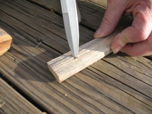 To make a fire board take a stick of wood about an inch to an inch-and-a-half in diameter and about a foot long.  Trim off two opposite sides of the stick to leave a flat board about 3/4″ thick.  Take the point of your knife and dig a small starter hole in the middle of the board about two inches from the right end. Pictured below: top, Section of dry Yucca stalk; middle, Removing sides of the stalk to leave a flat board; bottom, Making a small starter hole in the fire-board.