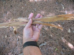 FIRE BOARD & SPINDLE – The fire-board and spindle should both be made of the same kind of wood.  A dry soft wood like yucca stalk or cottonwood root is best. Woods like willow or cedar can be used but are not as good.  Avoid hard or resinous woods like oak, hickory or pine.  Whatever kind of wood you use, it must be dead and completely dry.  Wood that has been dead at least six months is recommended. Pictured below: Yucca plant.