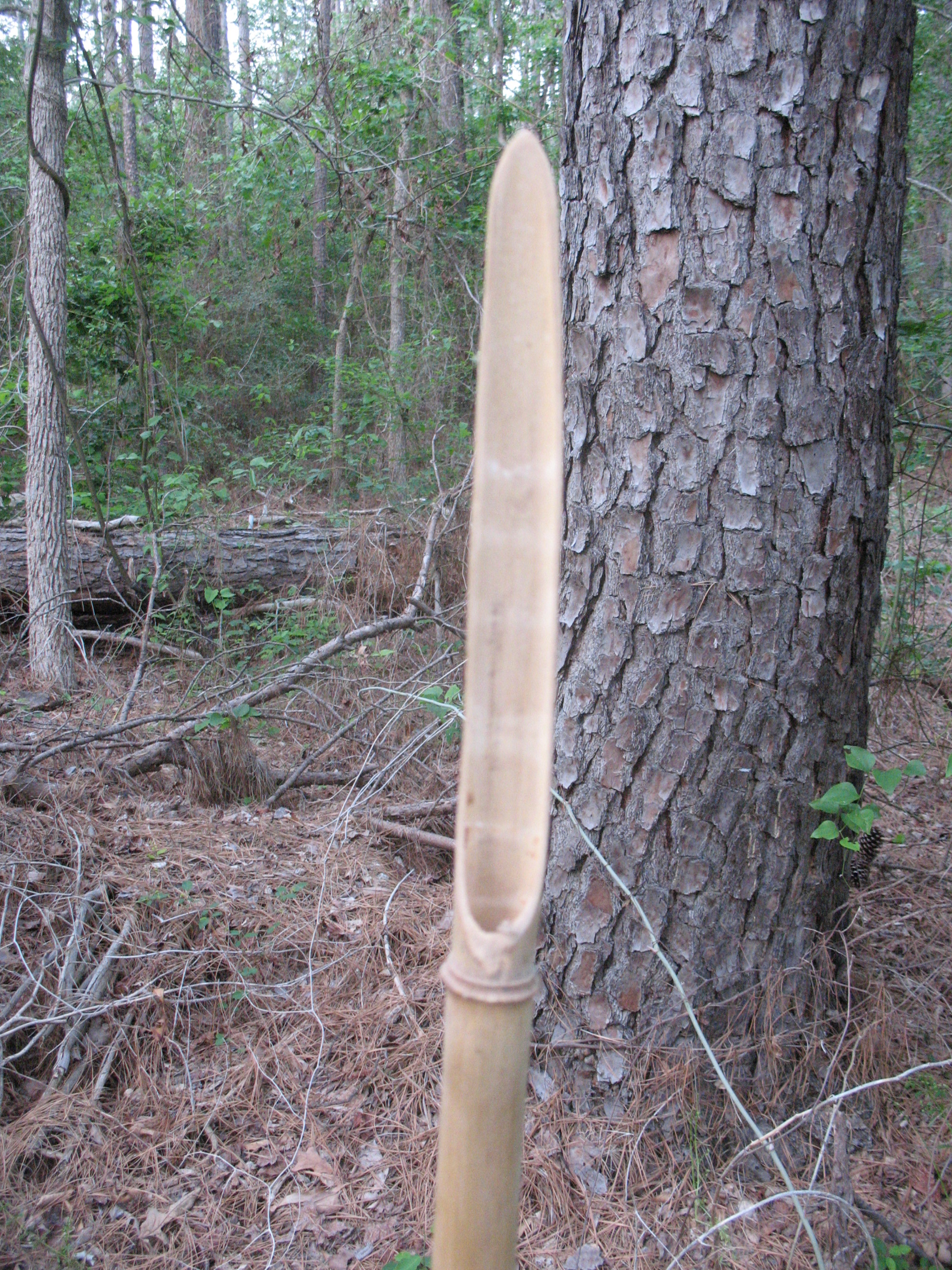 To make a cane spear you follow the same procedure.  Make the spear out of a piece of cane that is six or seven feet long.  Cut the spear point on the big end of the cane.  I usually try and work it so that there is a joint right at the base of the spear point.  This seems to make the point a little stronger.  Pictured below: Two views of the blade on a bamboo spear