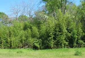 I like to make bundle bows from bamboo because it is light, strong, flexible, and easy to find.  Once you’ve located a bamboo grove it only takes a few minutes to harvest enough canes for a bundle bow.  You will need six to eight canes to make a bow.  Select canes that are about the size of your little finger at the base and that don’t taper down too quickly.  Pictured below: A nice grove of bamboo