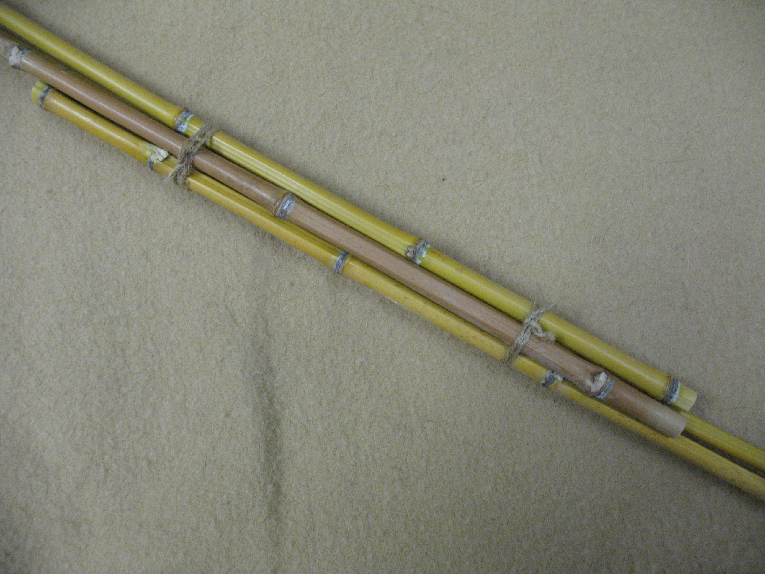 Once you’ve collected your canes you will need to cut them to length.  We are going to make about a five foot long bow, so you will need to cut your canes about three feet long.  Pictured below:  Bamboo canes and cordage that we will use to make the bow