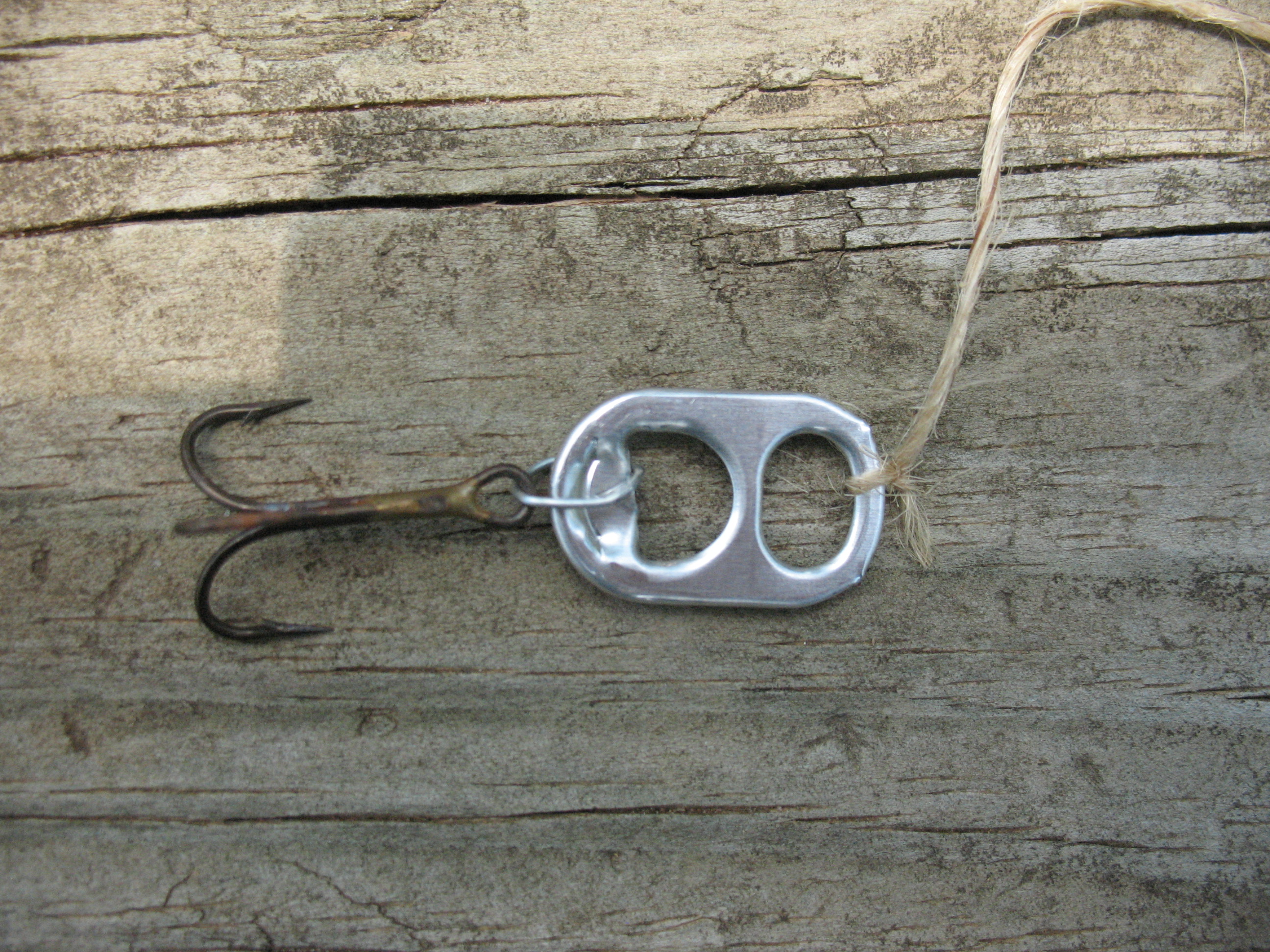 Remove the pull tab from an aluminum drink can and attach a fishhook to it to make an artificial lure.