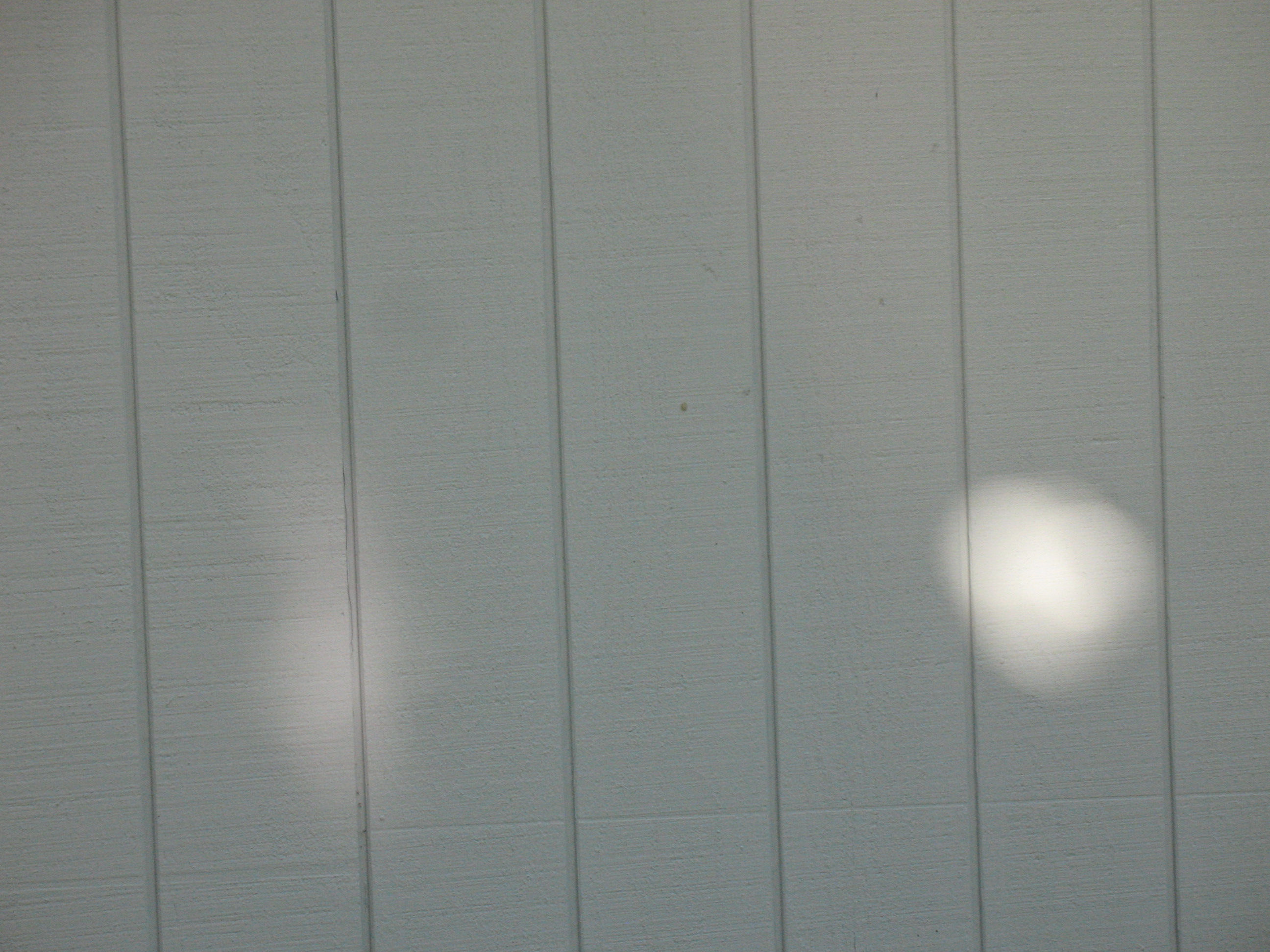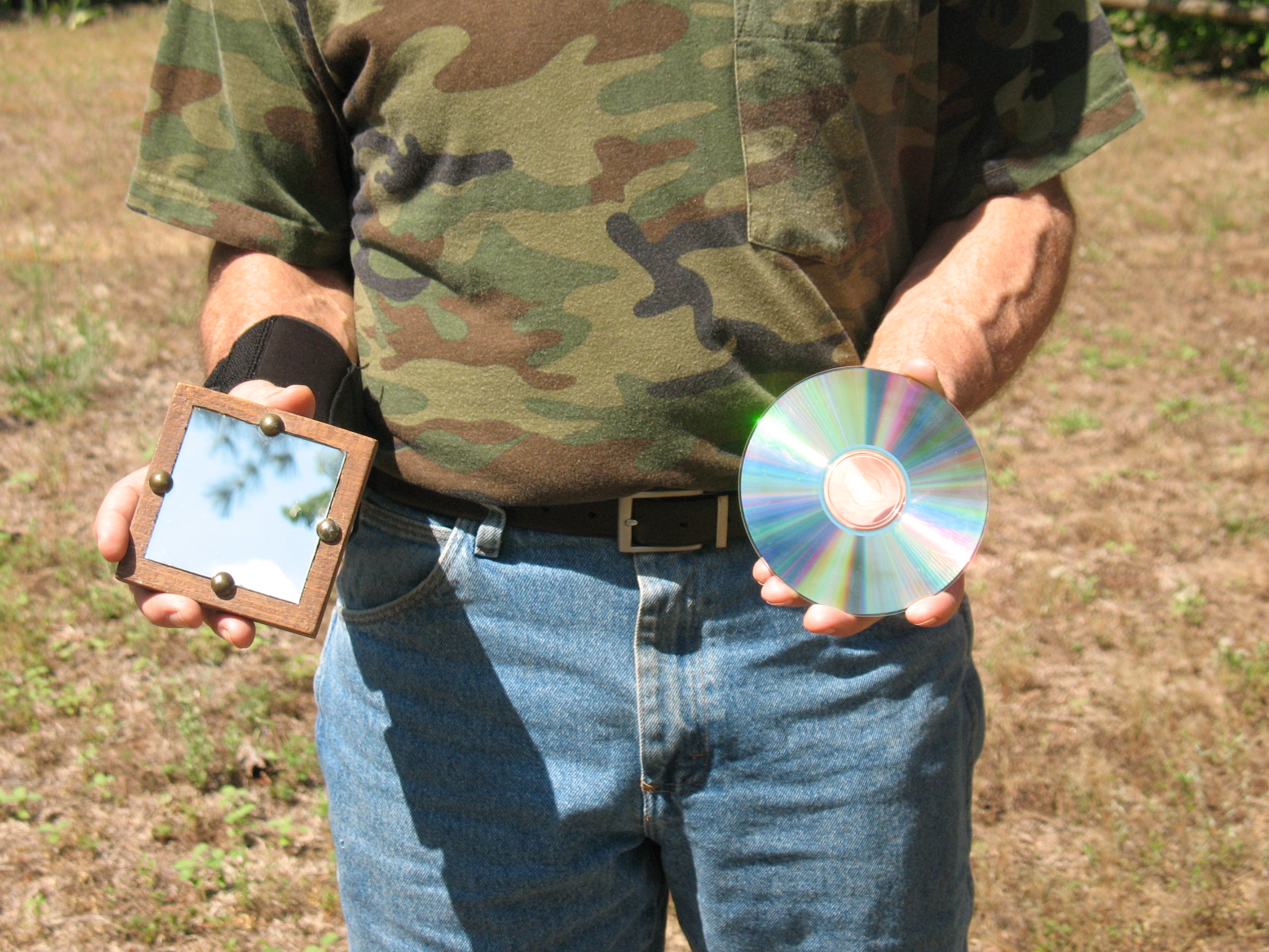 Much has been made of using an old CD for a signal mirror to signal aircraft.  This can be done, but a CD is far less efficient than a mirror.  Never the less, a CD is far better than nothing at all.  Pictured below: top, a CD and a real mirror; bottom, the light that they produce when shone on the side of a house fifty feet away.  CD flash is on the left, Mirror flash on the right.