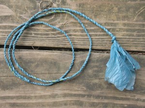 hese things are everywhere.  When I go canoeing I see them draped in trees where the high water has left them.  Plastic bags can be used hold wild plants as you gather them. If there is a chance of rain, you can gather dry fire tinder and store it in a plastic bag to keep it dry.  A plastic bag makes a good emergency rain hat.  Fashion a hood out of a plastic bag to help cut the wind and retain heat that radiates off of your head.  Plastic bags stuffed with cattail down or shredded cedar bark can be worn over the hands as emergency mittens to prevent frostbite.  A large plastic bag can be used as a poncho, a ground cloth, or an emergency tarp.  A plastic bad can be sealed over the live foliage of a tree limb to act as a mini-solar still for collecting water.  Please note that you don’t get much water from one of these, so ties on as many as you can find. Plastic grocery bags can be twisted up into light-duty cordage.  Pictured below: Four feet of cordage made from one grocery bag