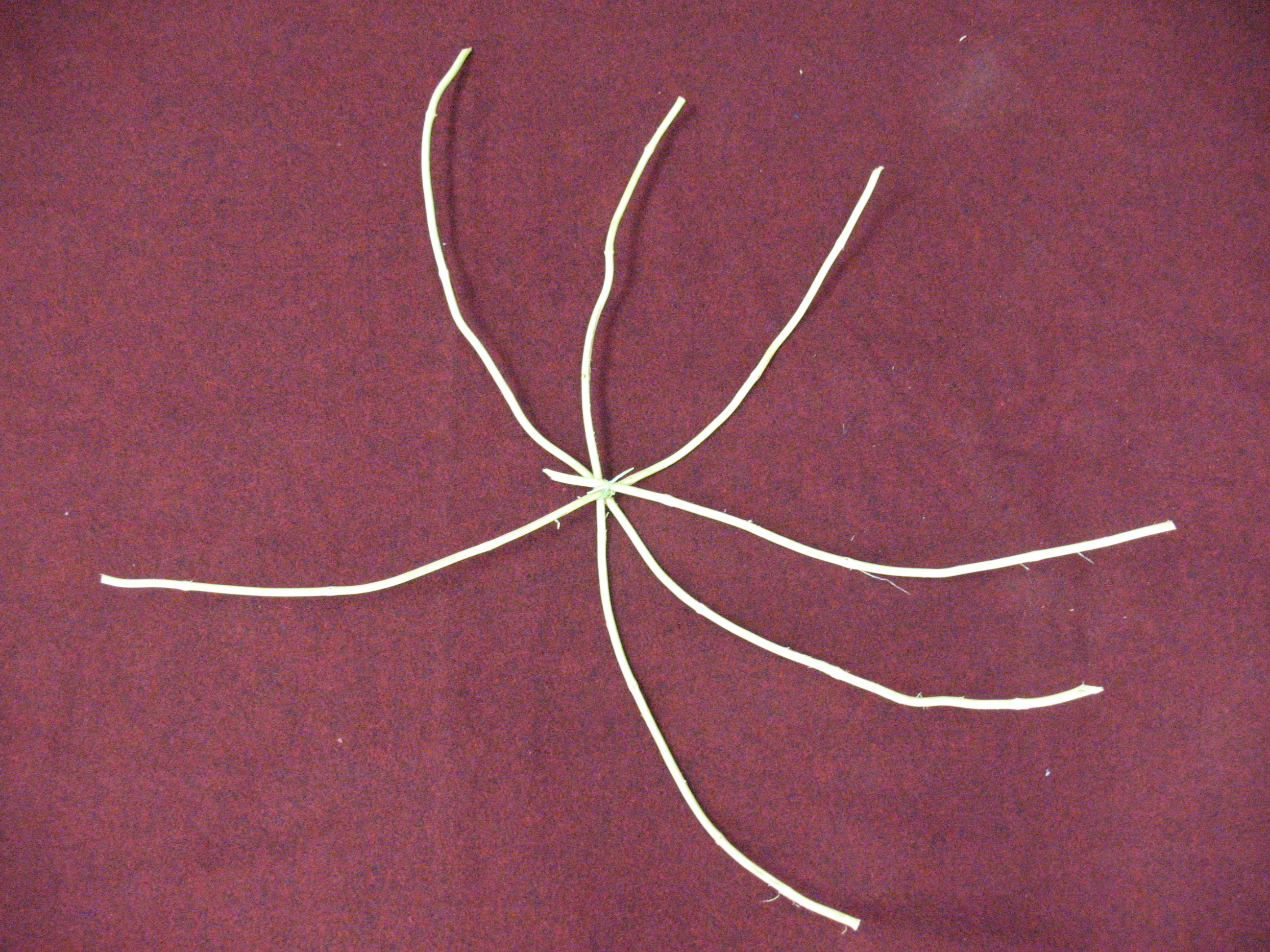 Now take your freshly soaked vines and let’s start on our basket.  We’re going to make a gathering basket that is about ten inches across at the top and eight or ten inches deep.  The first thing that we need to do is lay out the ribs (called “warps” in basket making) of the basket.  You will need to select some of the larger and straighter pieces for the warps.  These should be from 3/8 to 1/4 inch in diameter.  You will need three pieces that are about 30 inches long and one piece that is about 18 inches long.  You see, to make a woven basket you need an odd number of warps (in this case we’ll have seven).  If you have an even number of warps you will end up going over and under the same warp with each layer of your weft (this is the vine that you weave around and around the basket).  This sounds a little confusing, but you’ll see right away what I’m talking about.