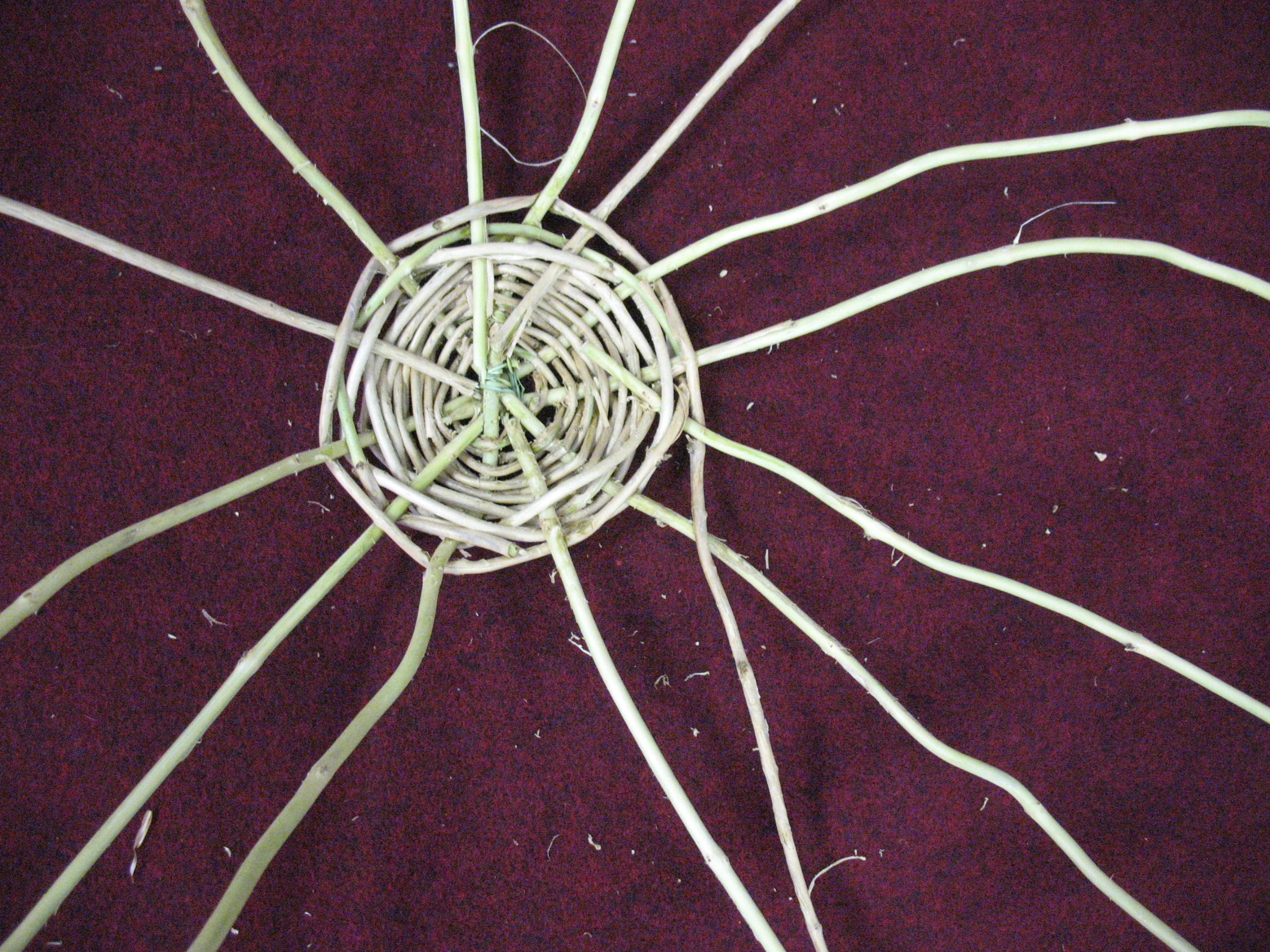As alternative method, instead of mucking about with however many vines/strands all at different angles try using two groups of three perpendicular to each other. It makes for an easier start and you just splay the vines to the desired angles as you continue to weave.