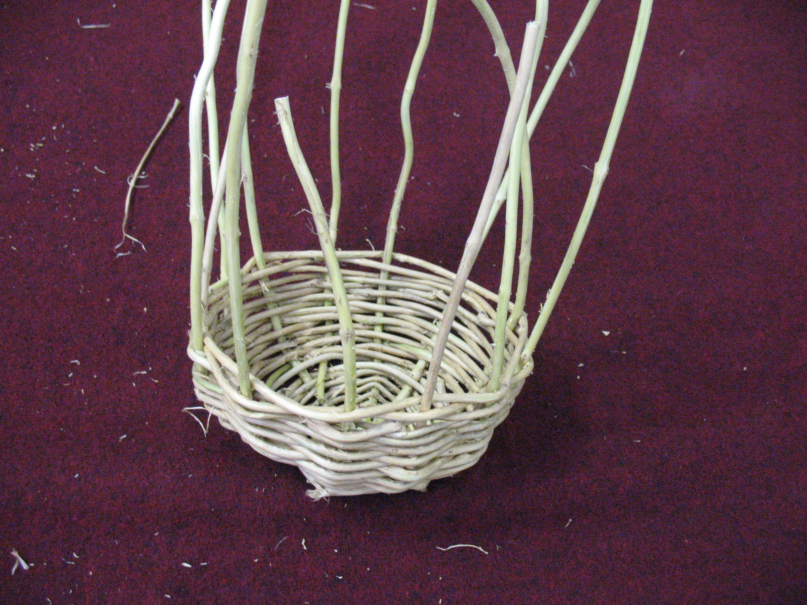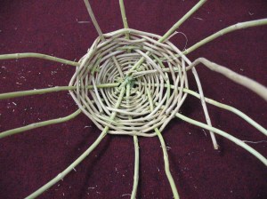 Since we are making a bowl shaped basket we don’t have to make any sharp turns with the warps.  Just bend them up gradually as you work and the rising weft will hold them in place.  When your weft runs out just let it end so that it is in back of a warp (inside the basket), back up about two warps, and start a new weft.  Continue weaving the weft until the basket is as tall as you want it.  Pictured below: top, turning up the sides of the basket; bottom, finished weaving and ready to finish out the rim