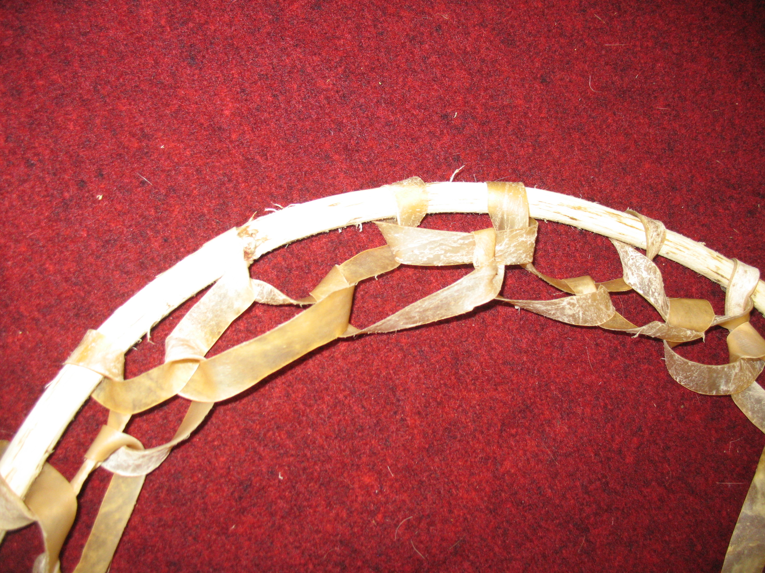 To begin the netting tie one end of your rawhide lace to the hoop and then make a series of fairly tight loops all the way around the hoop.  When you get back to where you started wrapping, drop down and keep going.  You will be creating a series of diamond shapes as you continue lacing.  The series of pictures below will show you how to lace the rawhide better than I can tell you with words.