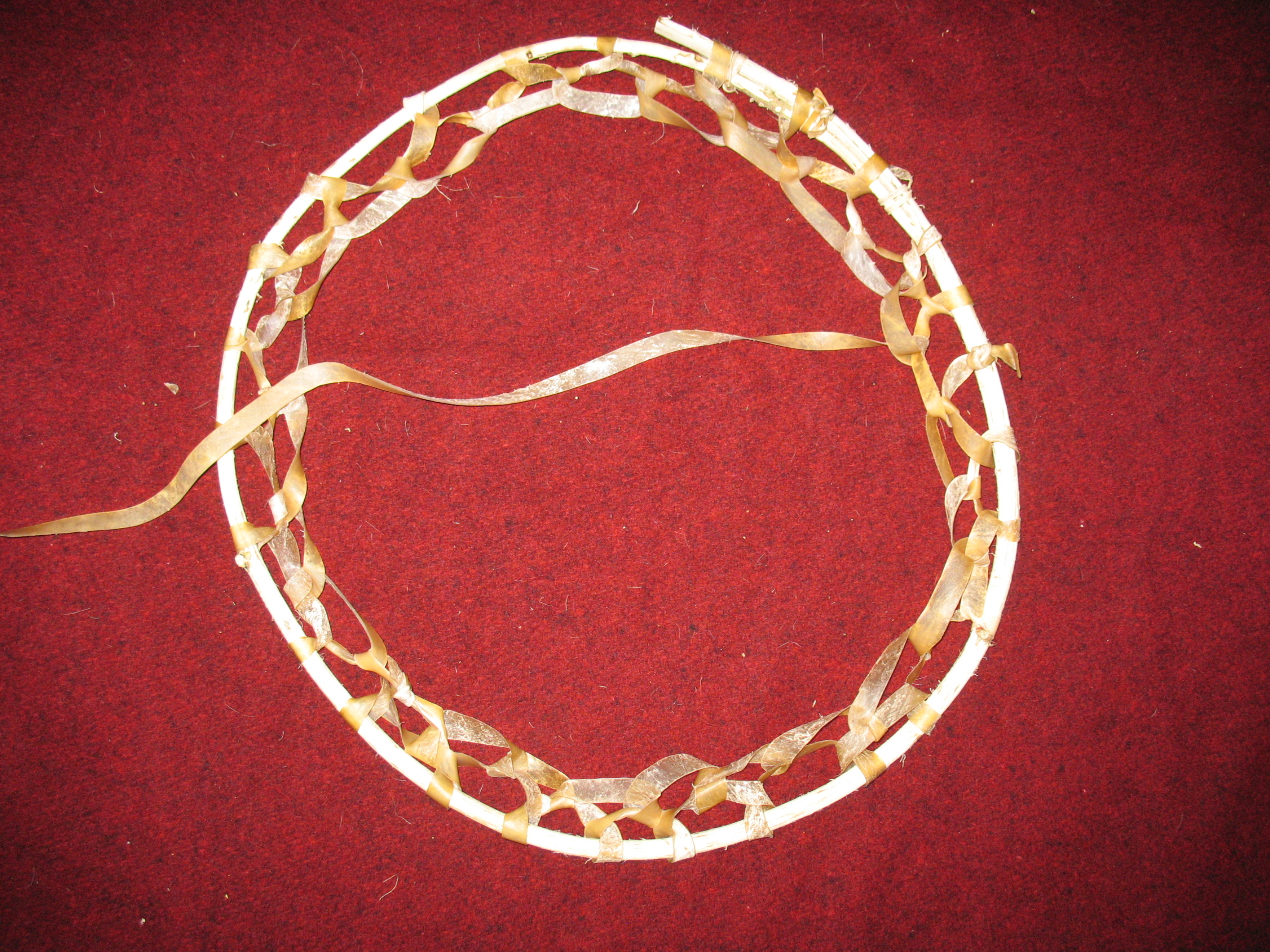 Since I have never seen any historical documentation of dream catchers prior to 1900, I have often wondered if some white man didn’t see a target hoop hanging in a teepee somewhere and when he asked what it was he was spun some yarn about how it was there to catch bad dreams.  Who knows?  Anyway, this is how you make a target hoop.
