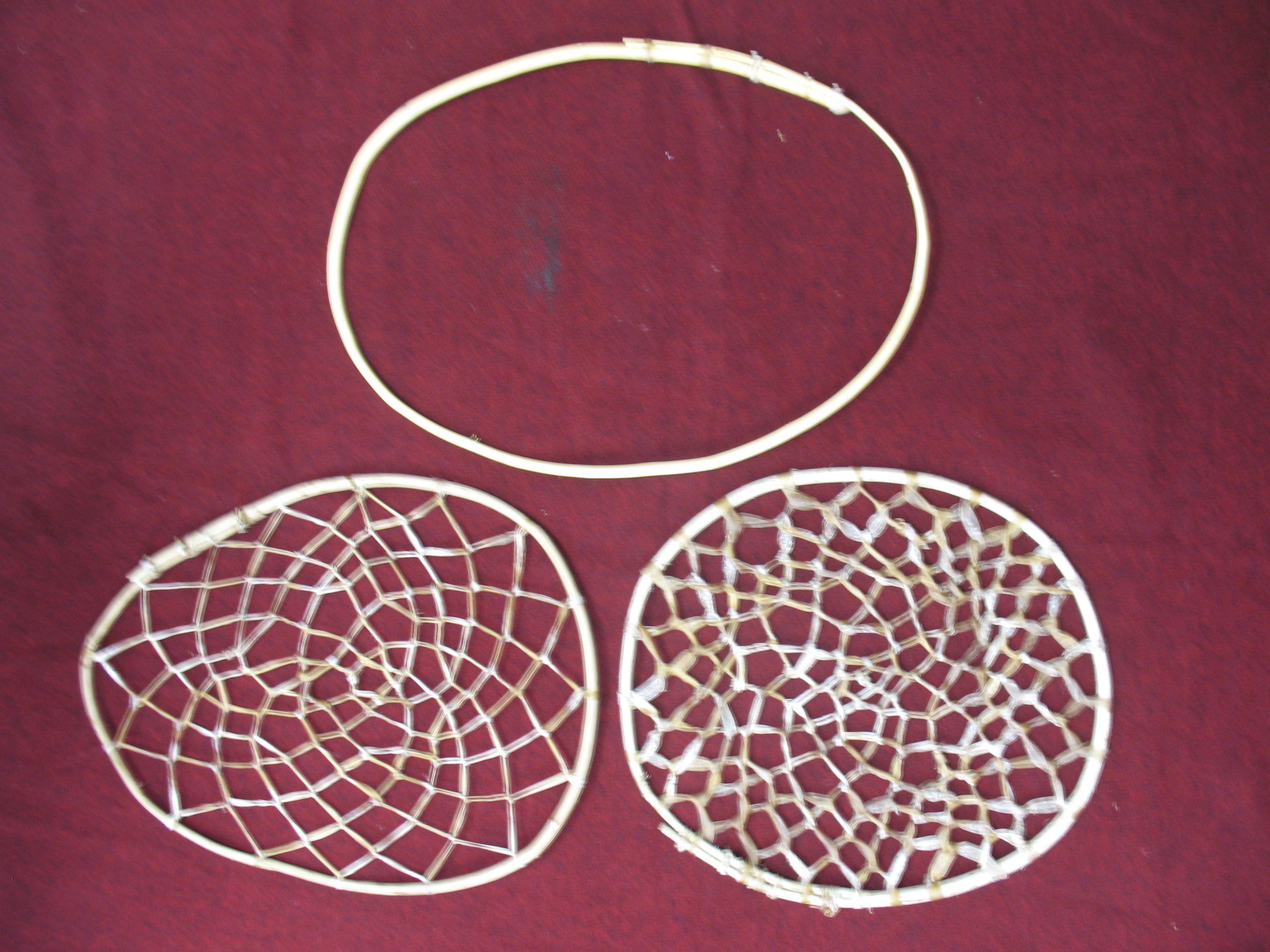 The basic parts of the pack are two wooden hoops with rawhide netting made like the target hoop from my last post, and one wooden hoop without netting. Of the two netted hoops, one should be pretty near round and the other should be more oval shaped. The un-netted hoop should be oval shaped. Pictured below: The basic parts of the pack basket