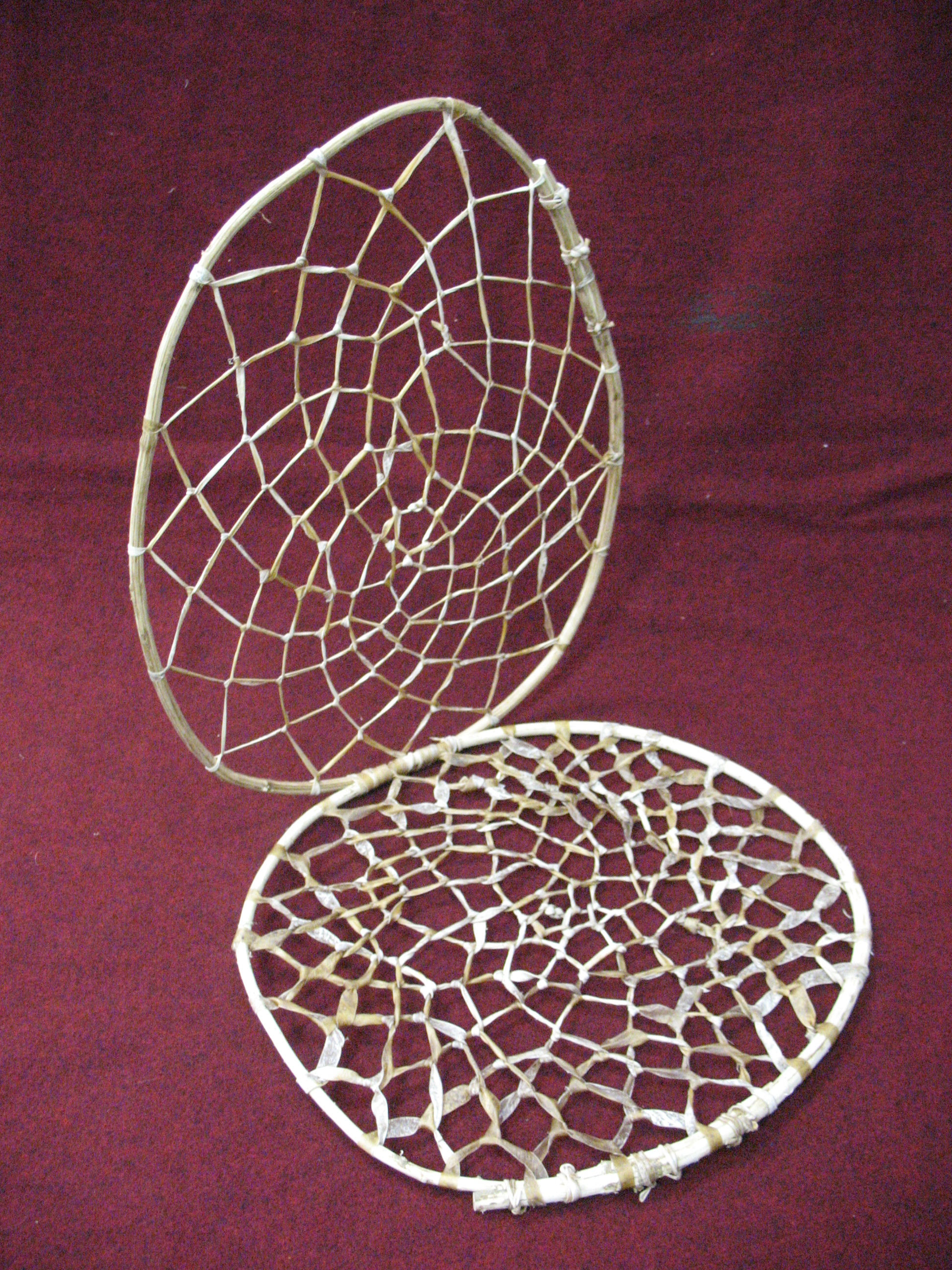 To assemble the pack, take some wet rawhide and lash the two netted hoops together as shown below.