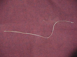 You don’t need a needle to sew with sinew.  Just leave the first inch or two of the sinew dry and stiff and that will serve as your needle.  Pictured below: Dried sinew “needle”