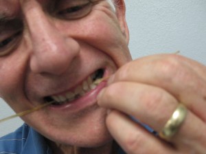 Chew lightly on the rest of the sinew to soften it and then tie a double knot in the tail end of the sinew.  Pictured below: top, chewing sinew: bottom, knot in the tail end of the sinew