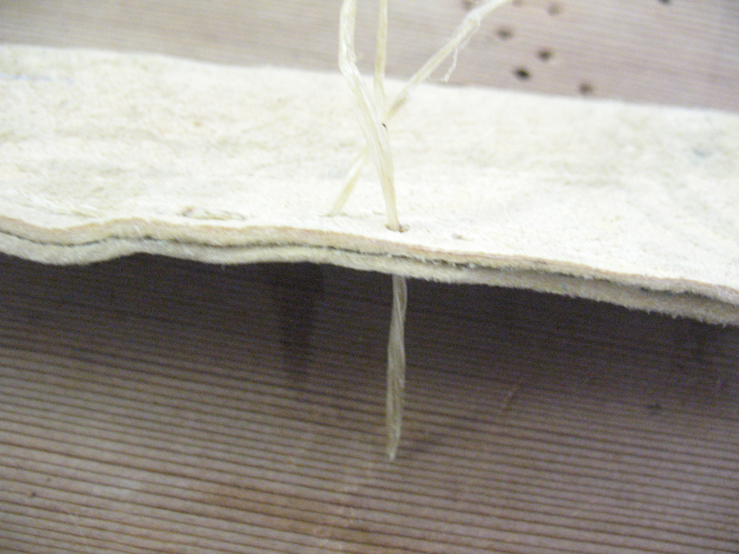 Start sewing by running the sinew up from the inside through one layer of the leather.  This will hide your knot in between the layers.  Go to the second set of holes and sew down through both of them, then back to the first holes and up through both of them, then once again down through the second set of holes.  This makes your first stitch a double stitch with the knot hidden between the layers of leather.