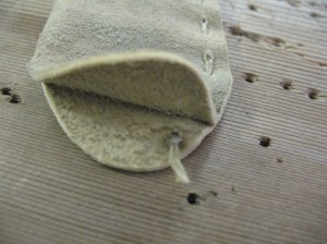 When you run out of sinew, you will have to start a new piece.  I have never found any definitive information on how this is done, so I have tried several different methods.  I tried twisting the new sinew and the old together.  Didn’t work.  The wet sinew would pull apart.  I tried tying the new sinew to the old.  Didn’t work.  Again, the wet sinew would slide out of the knot.  If I let it dry first, the knot would be hard to pull through the holes, and you never knew if the knot was going to end up showing on the outside of a stitch.  So, this is what I came up with.  I don’t know if it’s historically accurate, but it works for me.  First I tie a knot in the old sinew so that the knot will be in between the layers of leather.