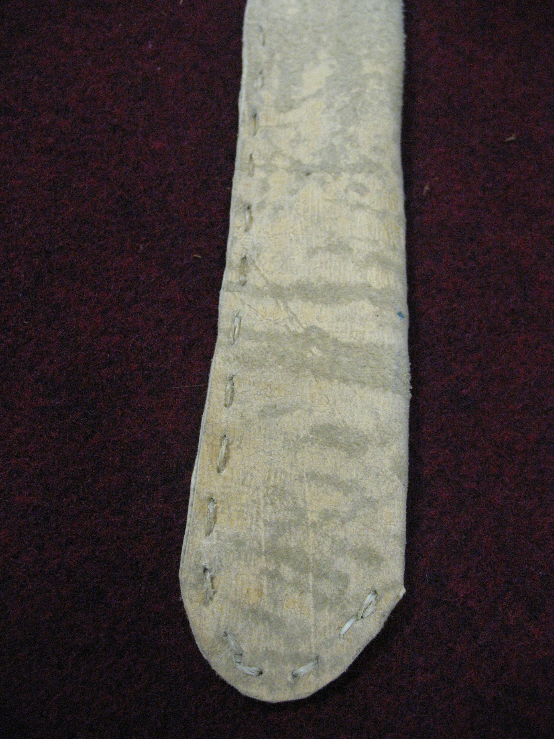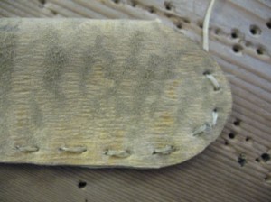 Now you can start punching and stitching down the length of the strap.  Pictured below:  Sinew “needle” sticking through pre-punched holes in leather