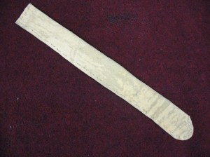 Many hobbyists and re-enactors use artificial sinew (waxed Dacron) to sew together bags, clothing, and other items.  It’s hard to tell the difference between artificial sinew and real sinew after the sewing is done, and the artificial stuff is sure more convenient to work with; but this is a blog about survival and primitive skills, and you don’t find waxed Dacron in the wilds.  So in this post I’m going to show you how to sew with real sinew.  The project I’m working on here is a set of straps for the pack basket that we made in the last post.  By the way, if you try this kind of sewing you will gain a quick understanding of why things like steel awls, metal sewing needles, and linen thread were such popular trade items with the Native Americans.