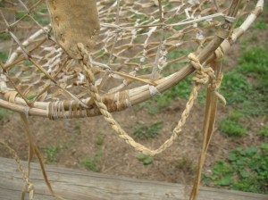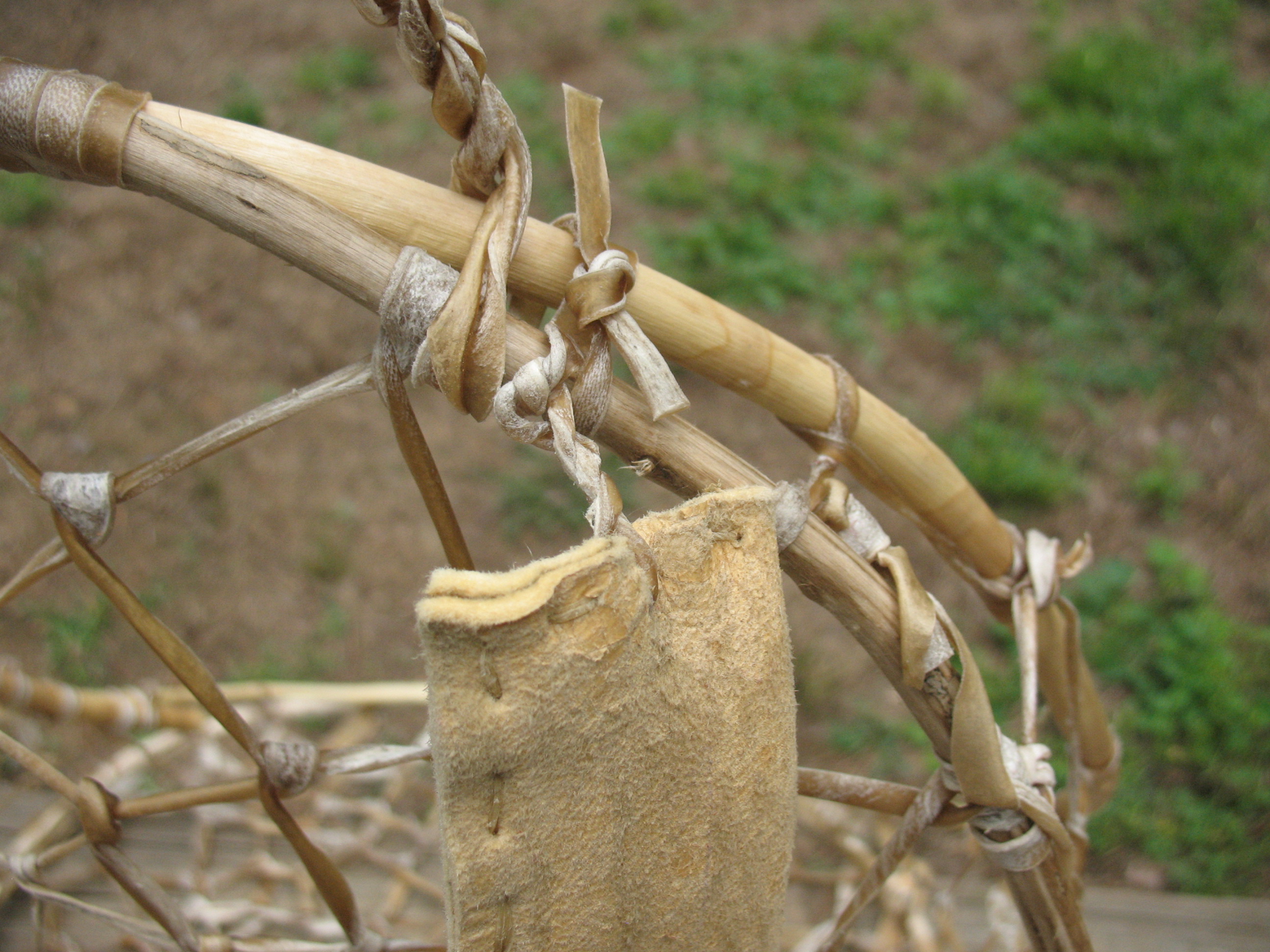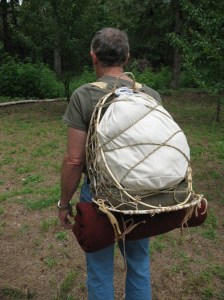 I add a couple of brain tanned thongs on the bottom of the basket so that I can tie my bedroll to the bottom.