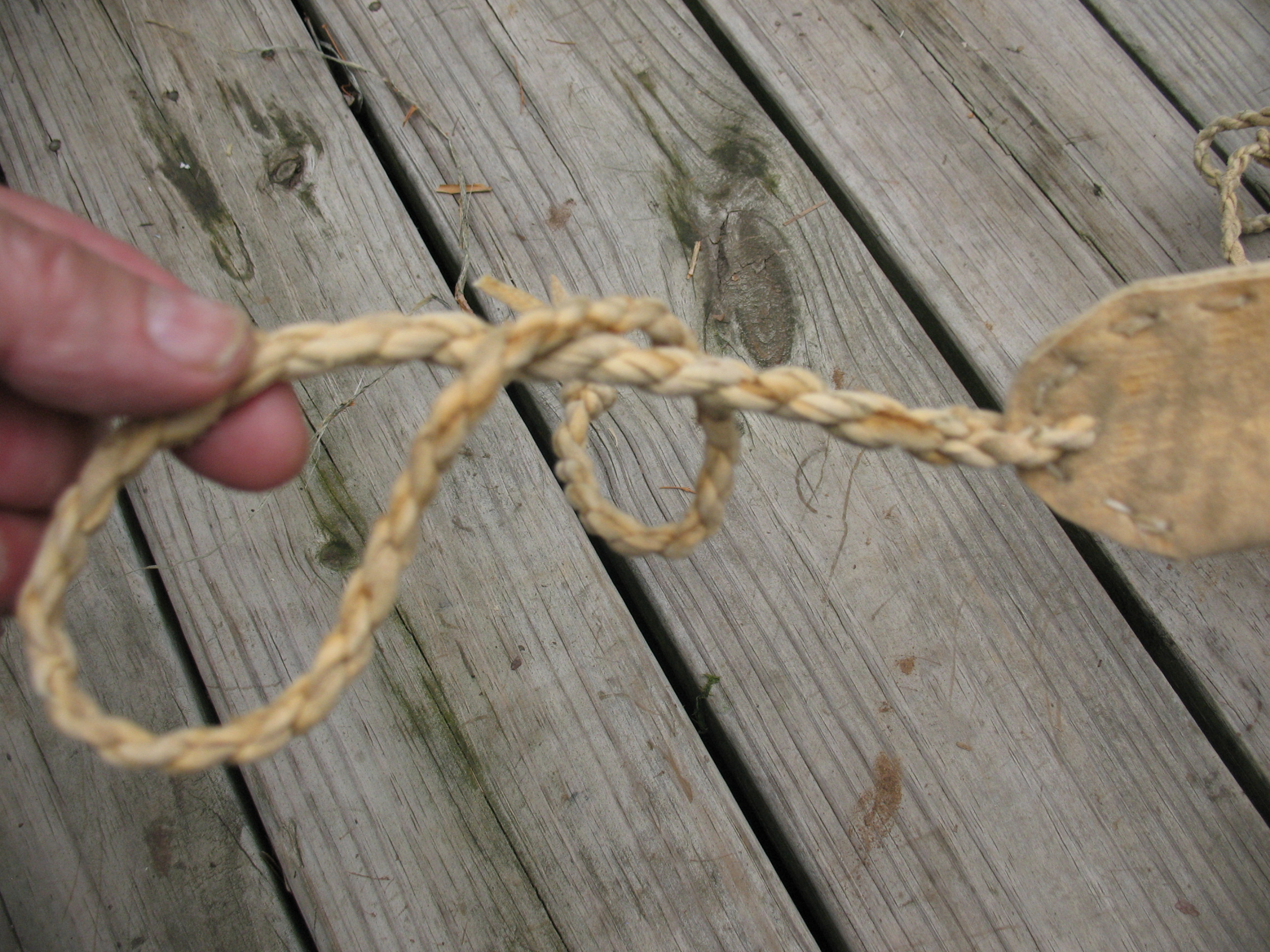 On the bottom of the straps I twist up some brain tanned elk hide and insert it through the hole.