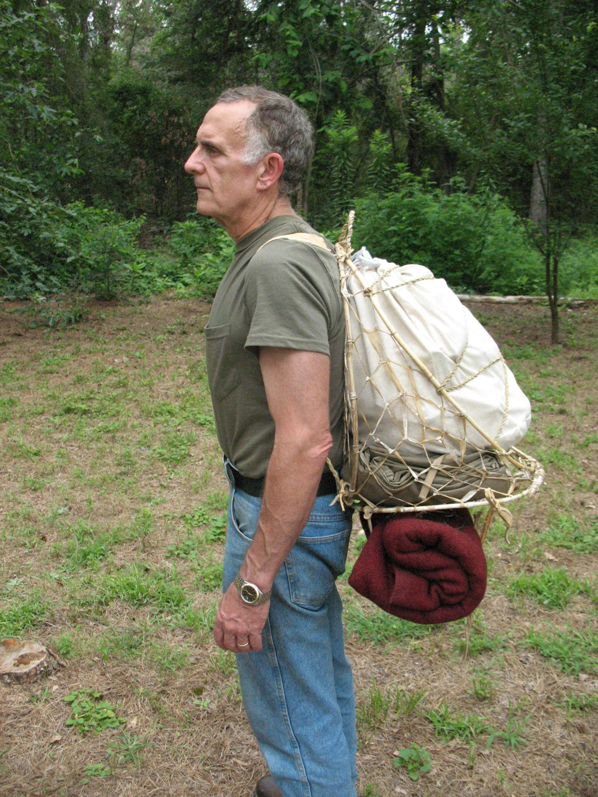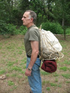 And here’s the finished product. My tarp and a canvas bag with all my gear are lashed into the basket, my bedroll is tied on to the bottom of the pack, and the straps are adjusted for a comfortable fit. Ready to head for the woods.