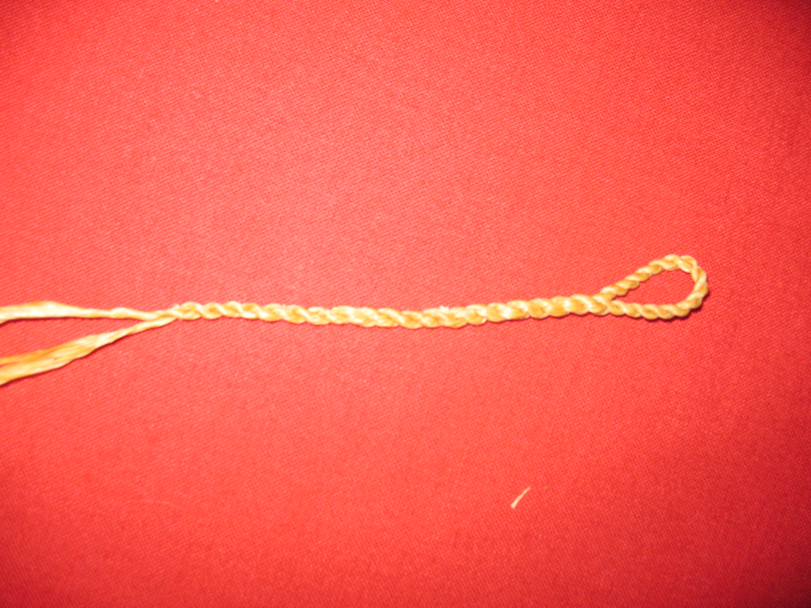 A Flemish loop is a loop that is twisted up as a permanent part of a bow string. It is not a tied loop. It is built in during the process of making the string. I have never seen an example of an old Native American bowstring with a Flemish loop, nor have I ever seen any documentation of Native Americans using the Flemish loop. This is not to say that they didn’t; it’s just to say that I have never seen any proof of it. So, if you are trying to make a reproduction of an authentic Native American bow, you probably don’t want to make a string with a Flemish loop. If, like me, you make wooden bows to shoot; a Flemish loop is a nice addition to the string. I personally make my strings with a Flemish loop on one end, and then I tie the other end of the string to the bow with a permanent knot. I do this whether the string is made of sinew, rawhide, yucca fiber, linen, or waxed Dacron. In this example I am making a string from eight strands of waxed Dacron. The string will be constructed by using the reverse wrap (posted elsewhere on this blog) to twist together two bundles, each bundle composed of four strands of waxed Dacron. Here is how you make a Flemish loop in the string: