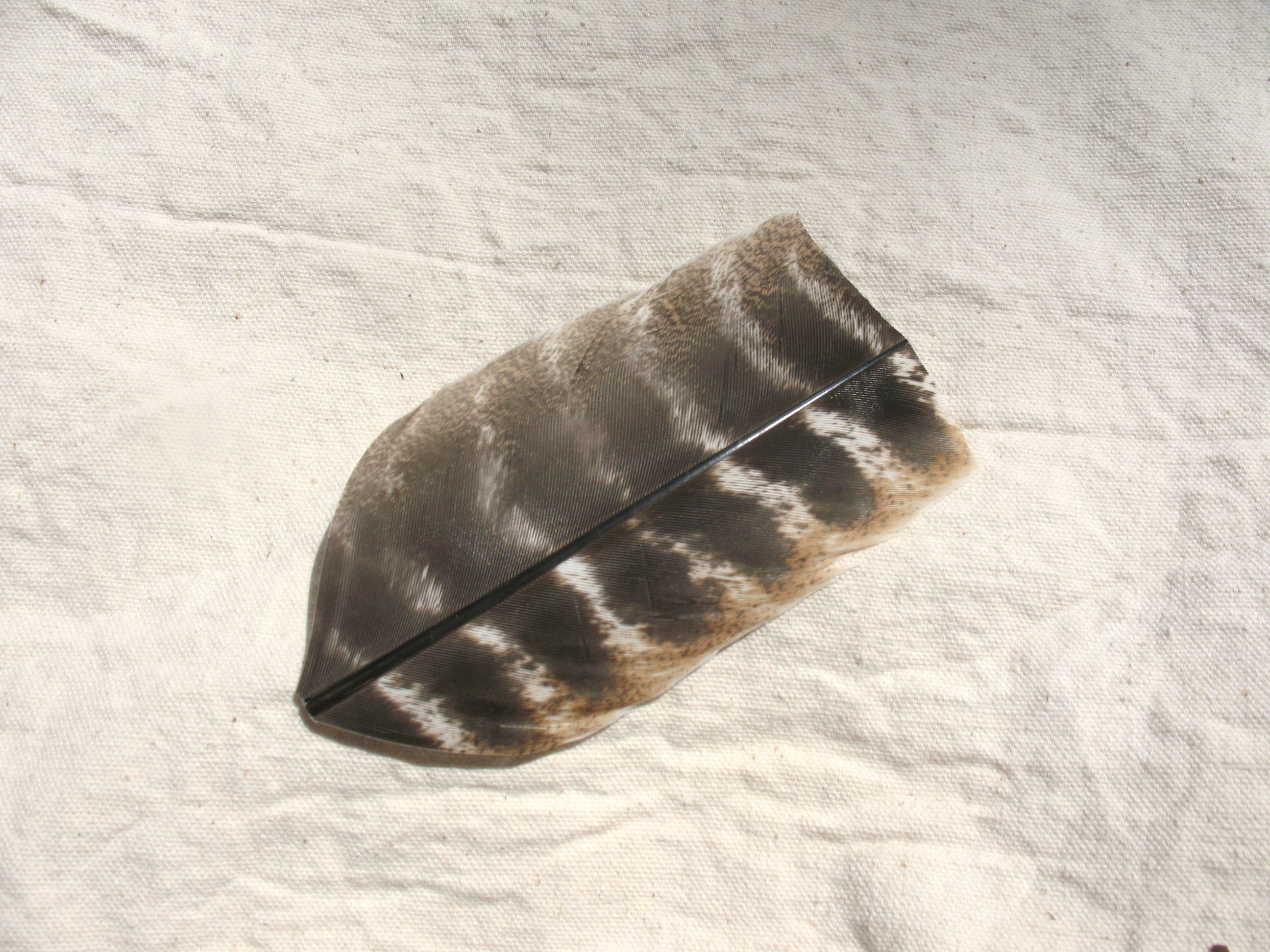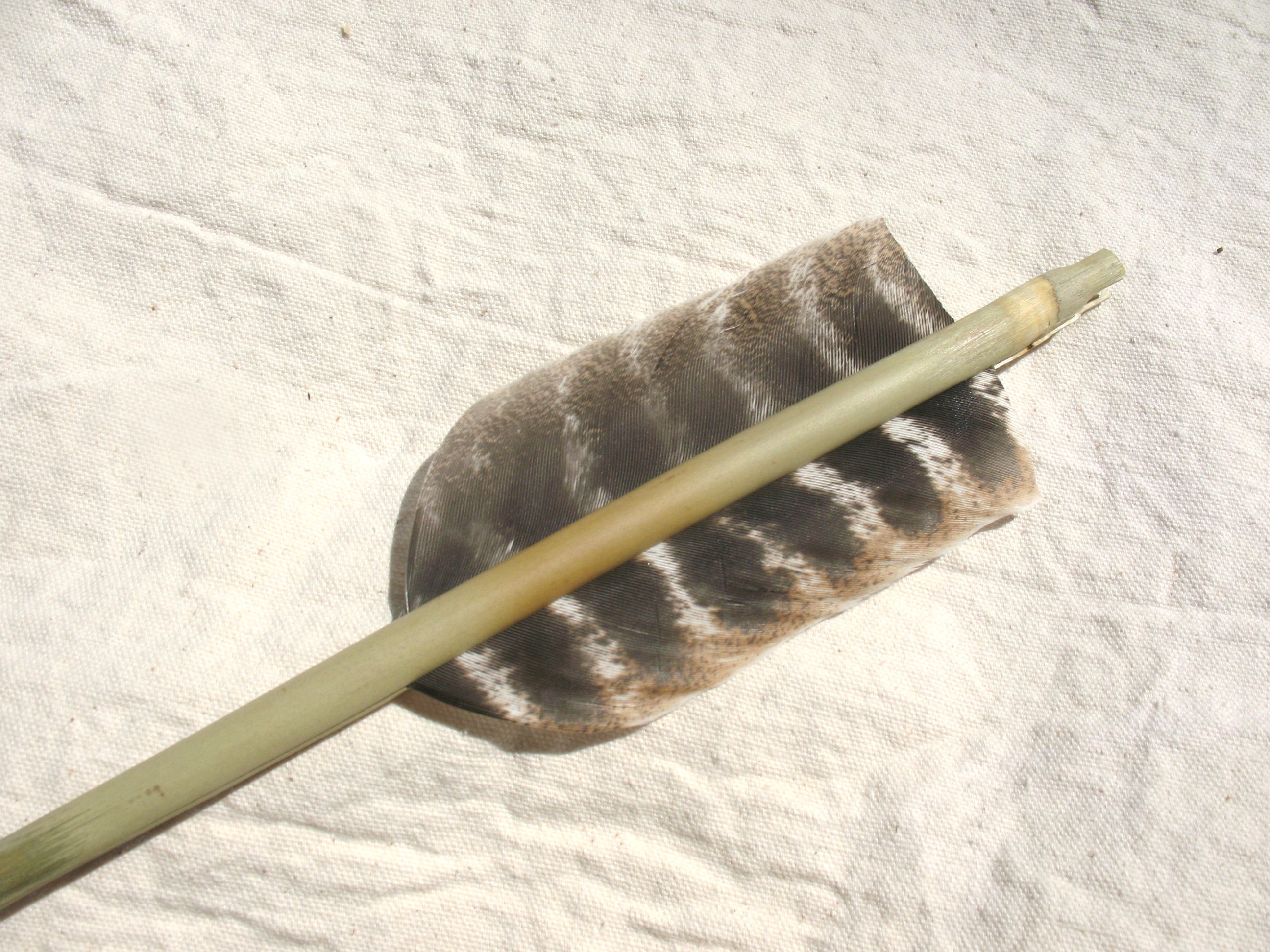 We are going to fletch this arrow with a wild turkey feather. Be sure to select a feather that has a good vane on both sides of the quill, and make sure that the vanes don’t curve too much.Take your turkey feather and cut a five inch section across the width of the entire feather. Pictured below: top, Wild turkey feather; bottom, section cut from whole feather