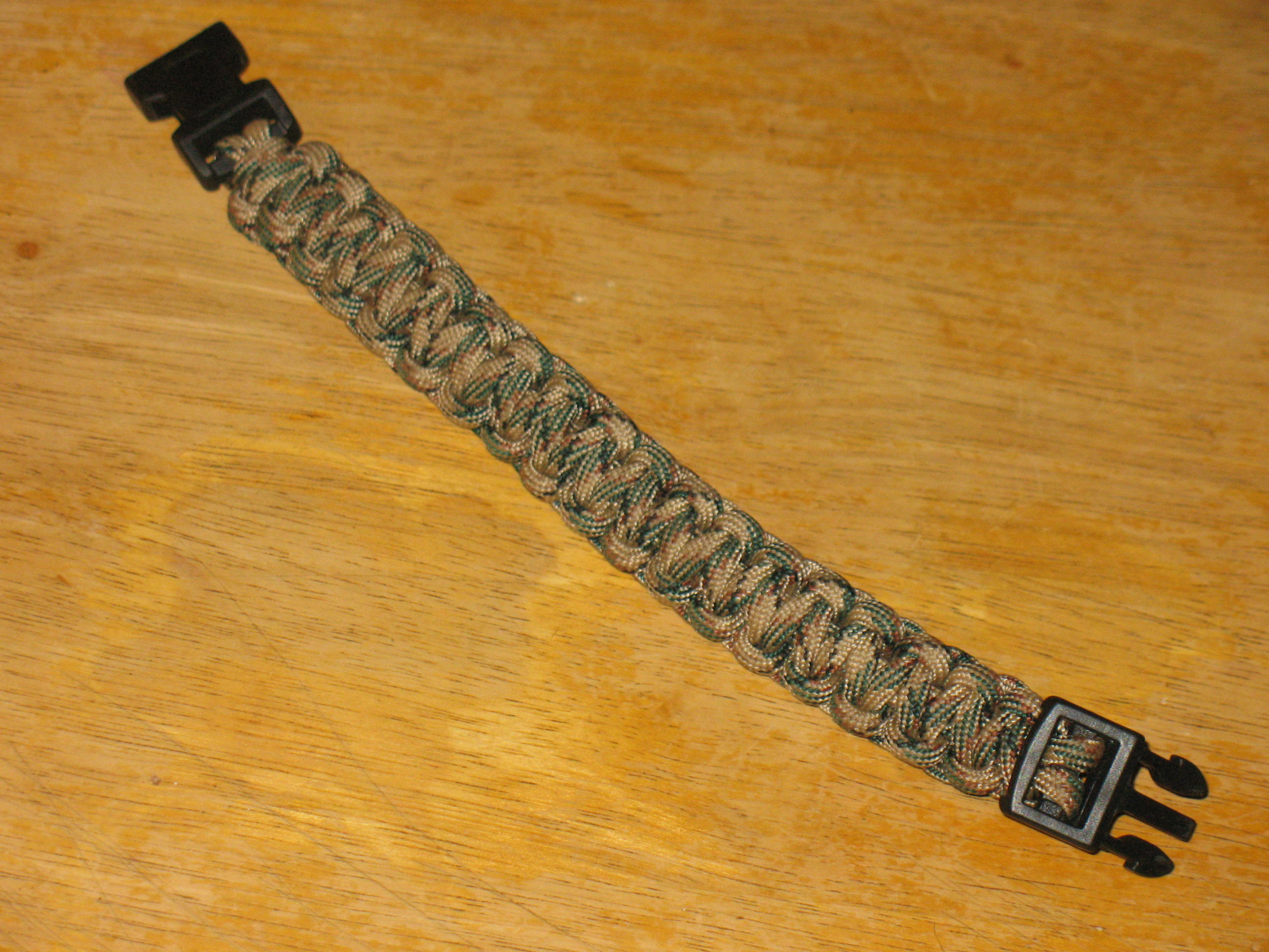 I first got the idea for survival bracelets when I noticed some of the bracelets that my students at school were wearing. One popular bracelet is called a Cobra Bracelet. The Cobra Bracelet is made by taking about eight or nine feet of 550 para-cord and tying it in a series of knots called cobra knots. The two pieces of a little plastic snap buckle are attached to each end of the bracelet so that it can be clipped on and off of the wrist. Pictured below: Two views of a Cobra Bracelet