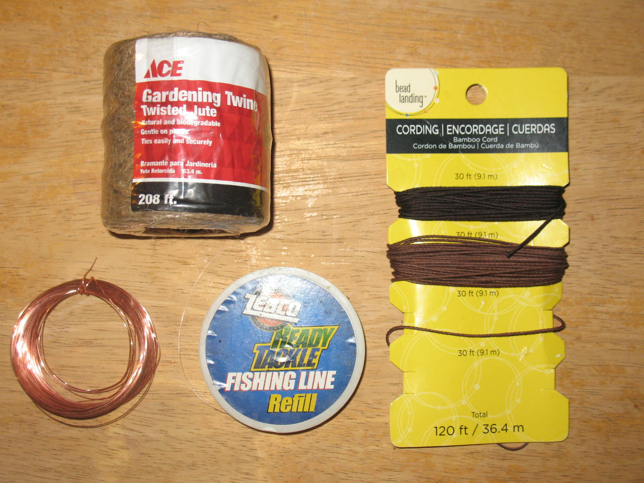 You will also need some jute twine that can be shredded apart to make fire-starting tinder, some light copper wire that can be used for snares, some mono-filament fishing line, and some general purpose hemp cordage. Pictured below: Jute twine, copper wire, mono-filament line, and hemp cordage.