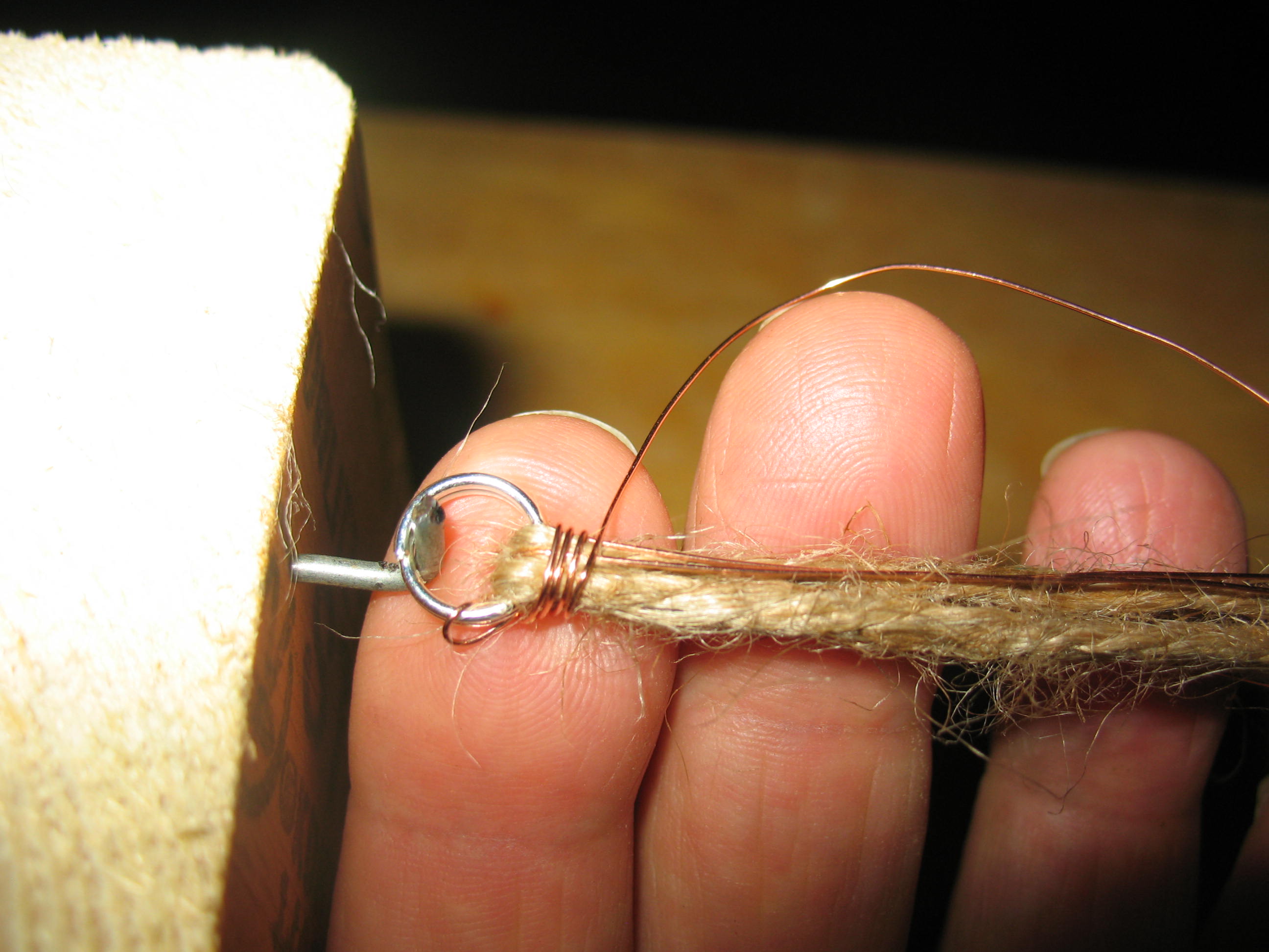 Beginning right next to the first split ring start wrapping the wire around the underlying strands of jute. Keep the wraps tight and try to lay them down neatly, right next to each other. Pictured below: Wrapping the copper wire.