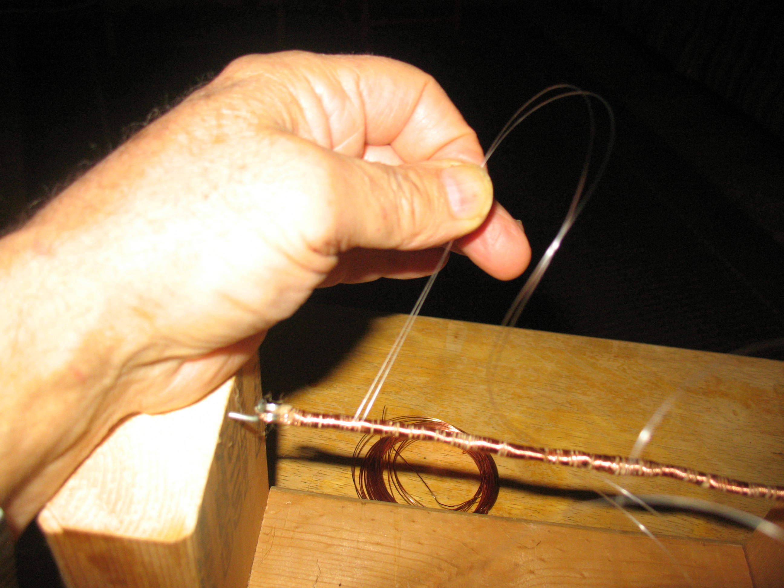 Now we will add a layer of mono-filament fishing line. Cut a piece of mono about 10 feet long. This time, instead of running the line through the split rinds you are going to tie the line on below the first split ring, right above where you started wrapping the layer of wire. Make your tie with a single over-hand knot right in the middle of the mono so that you have two long strands of line hanging loose. Hold these two strands together and begin wrapping them around the layer of snare wire. Try to keep them flat and even (not easy to do, but the mono is so thin that it won’t really matter). Pictured below: Wrapping mono filament line.