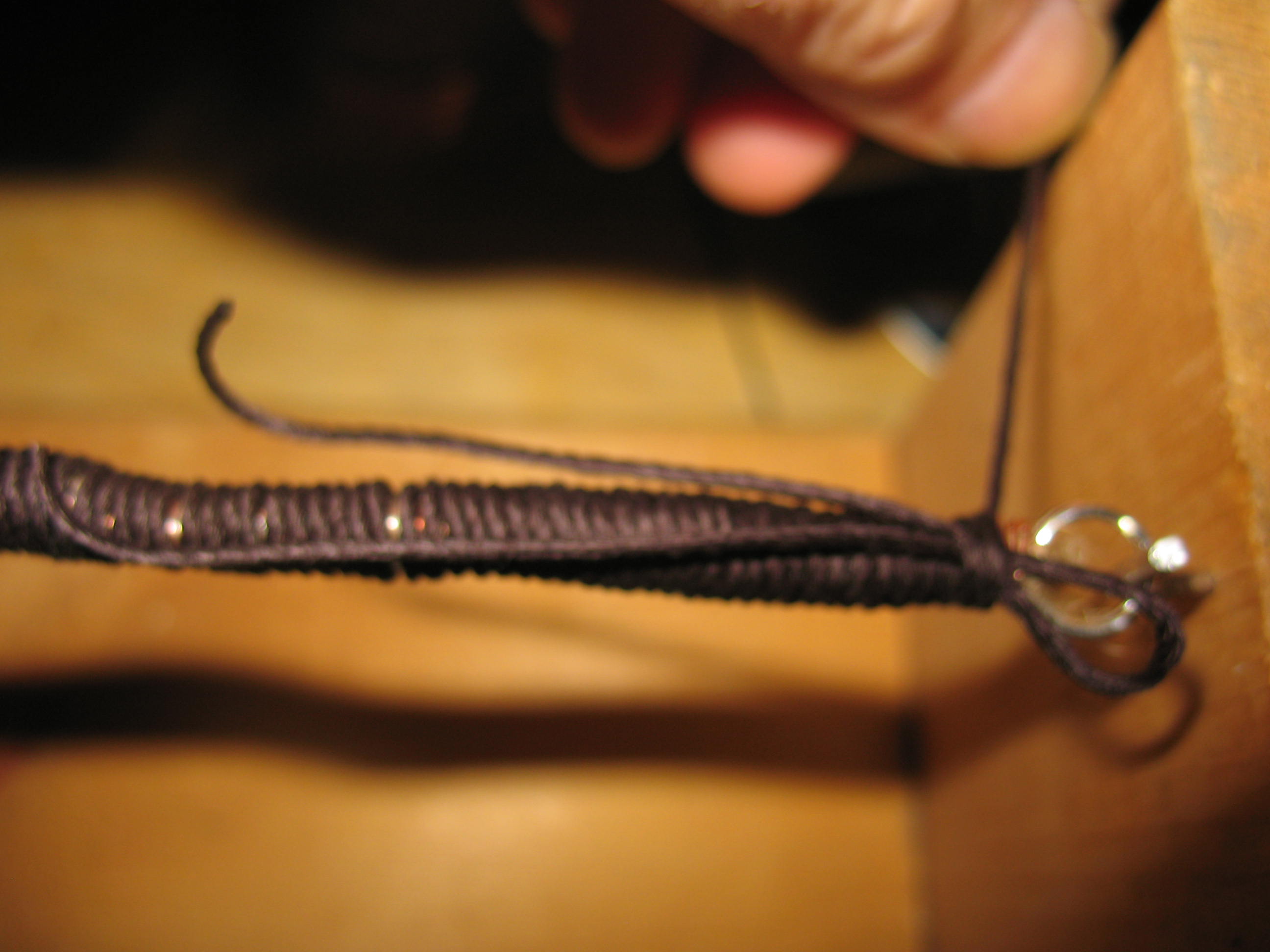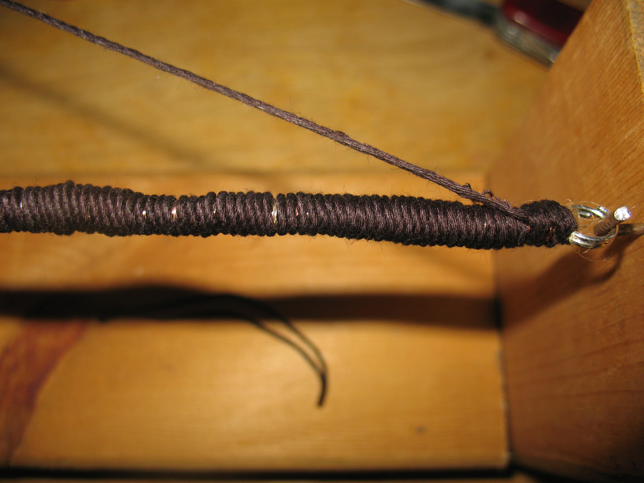 Now pull, gently but firmly, on the loose ends of the loop. This will pull the loose end of hemp wrapping back under the last four or five wraps. Cut of the excess. Pictured below finishing off the hemp.