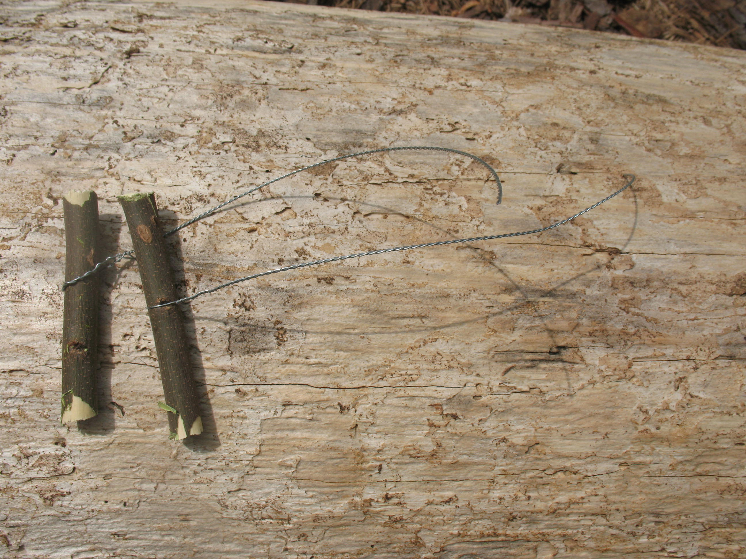 First I cut a piece of wire that was about two and a half times as long as I wanted the finished saw to be.  Then I cut a couple of short sticks for the handles.  Pictured below: wire and handles 02 wire and sticks
