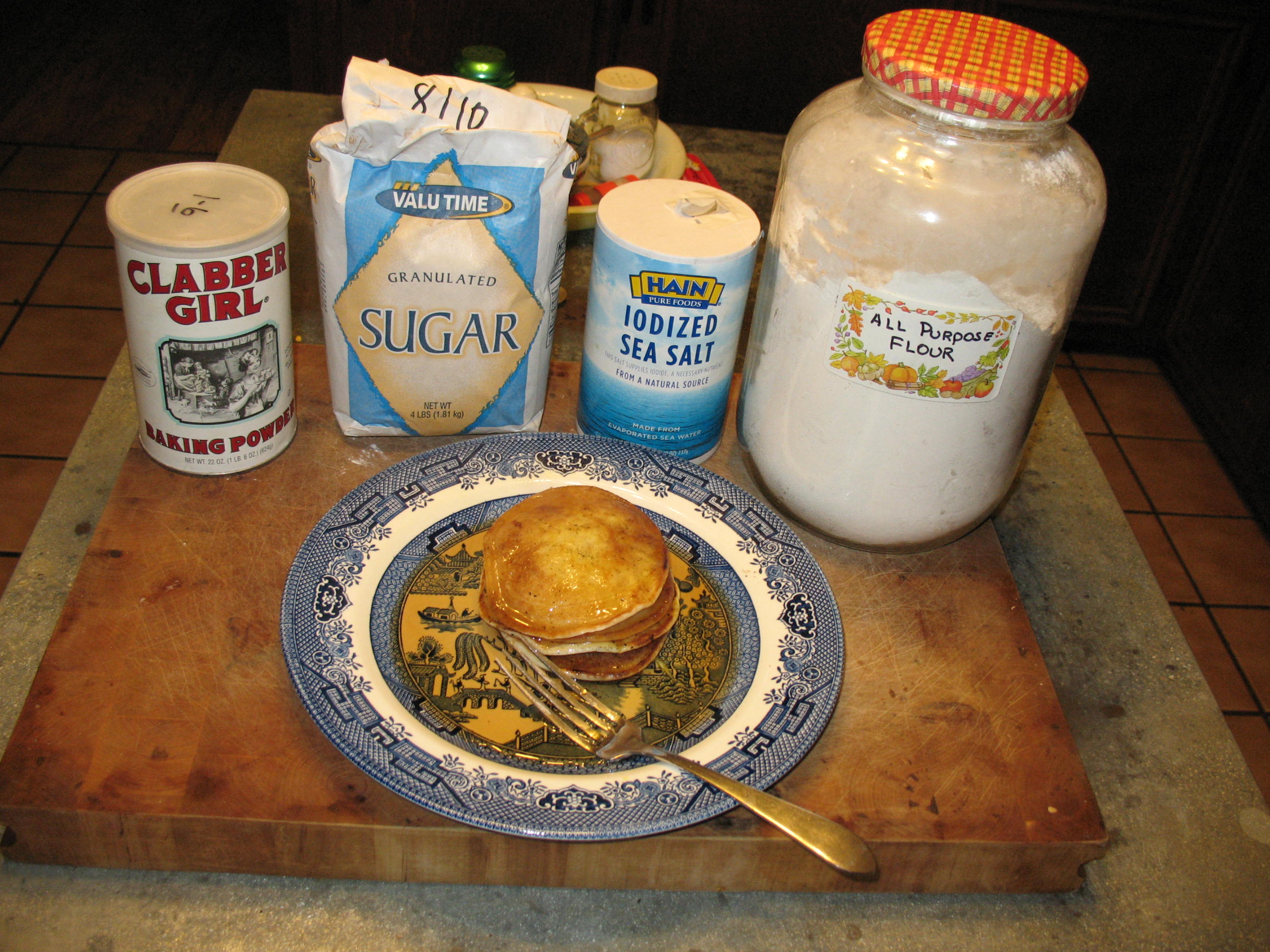 For years I made pancakes using a recipe that called for eggs, milk, and oil. The pancakes were good, but they were kind of a hassle to make. Also, eggs and milk kept me from making pancakes when going light-weight camping because it would entail taking powdered eggs (yech) and powdered milk and reconstituting them before cooking. About 20 years ago I went camping with a friend of mine who taught me how to make pancakes the quick and easy way, and I’ve been doing it ever since. The nice thing about this recipe is that you can make these pancakes using nothing but items from your food storage. I have also thrown in my mother’s recipe for pancake syrup; again, this requires only ingredients that can be part of your food storage.