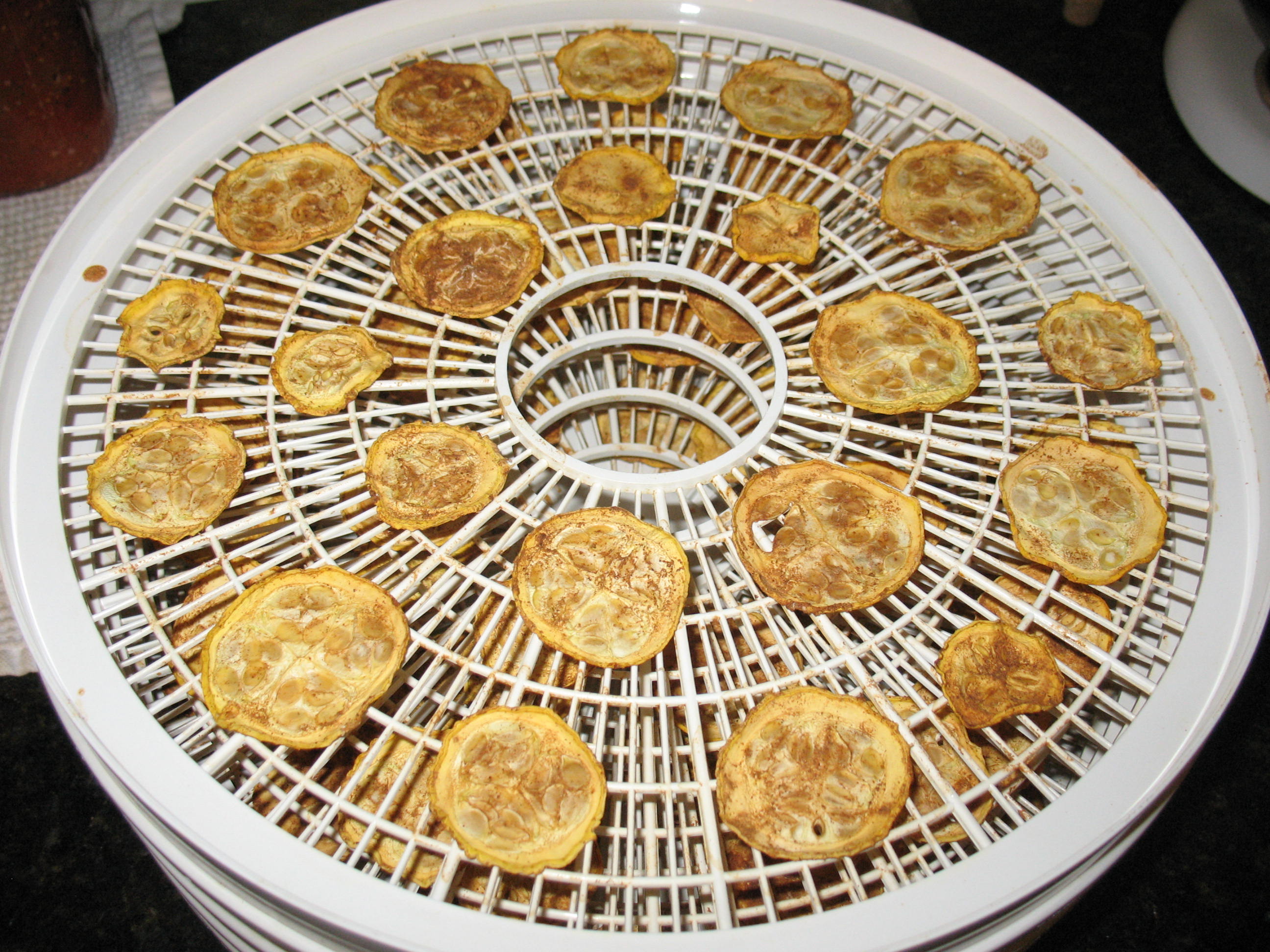 I use a Nesco counter top dehydrator to dry out my squash chips. You can use whatever type of dehydrator that you have, or you can use your oven. If you use an oven, set it at about 150 degrees and leave the door propped open.