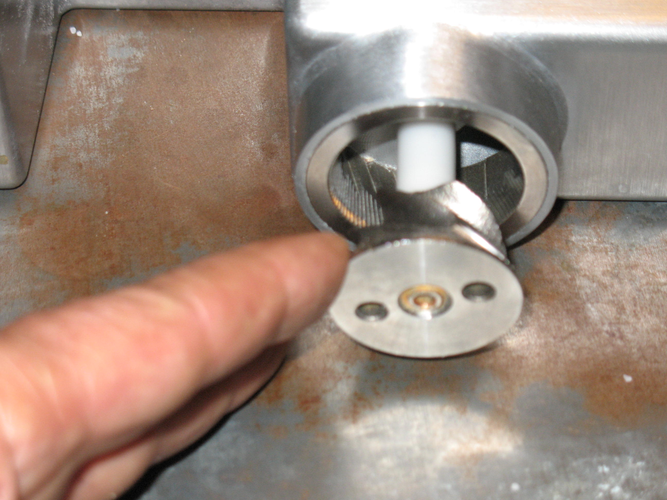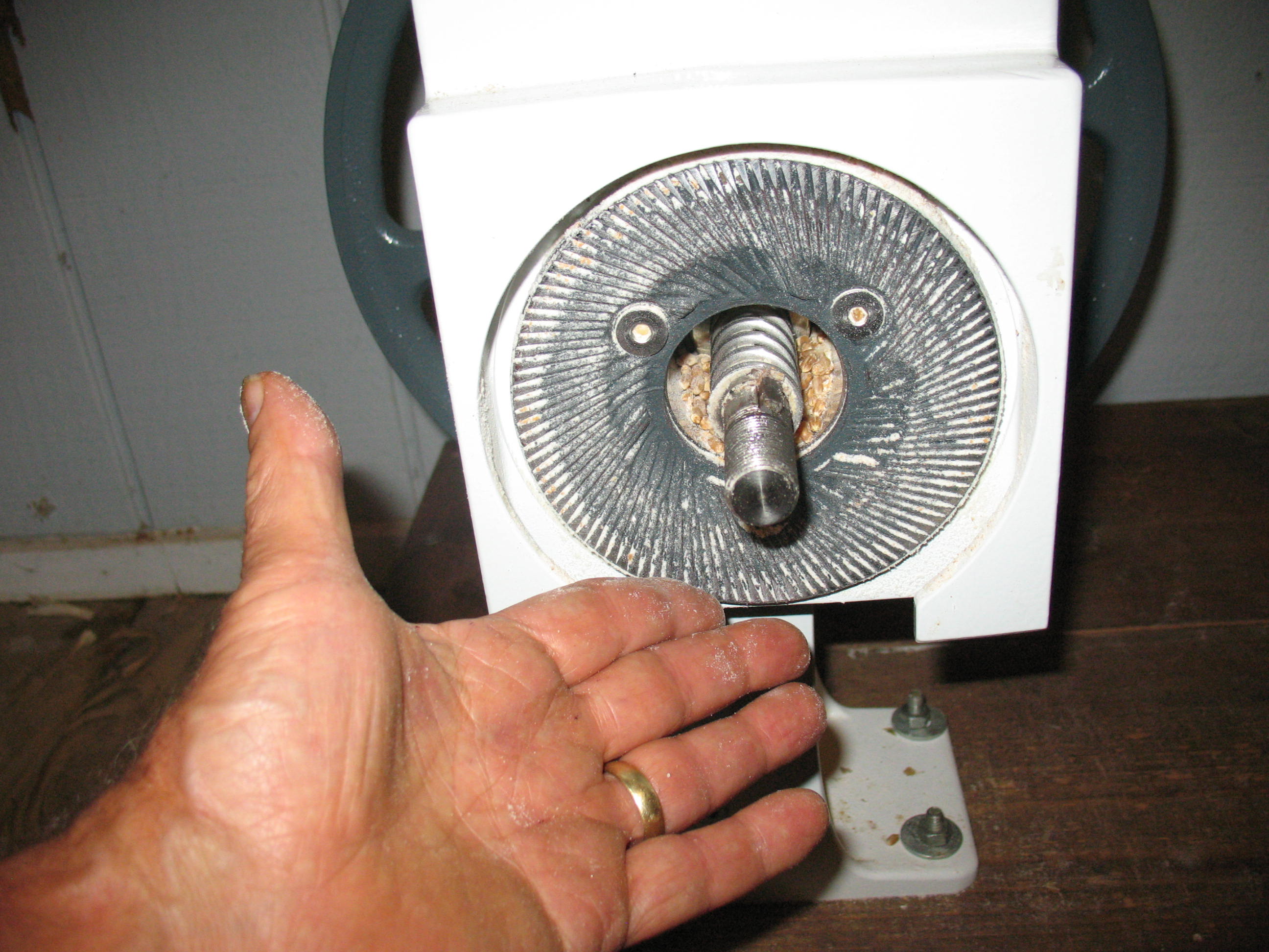 I will make one comparison between the Country Living Mill and the Victorio Mill.  The grinding plates on the Victorio Mill are approximately 1 3/8 inches in diameter, whereas the grinding plates on Country Living Mill are approximately 4 5/8 inches in diameter.  So turning at the same revolutions per minute the Country Living Mill will process way more grain than the Victorio Mill.  But, here’s the drawback; the turning radius of the handle on the Victorio Mill is 6 inches.  That’s a 6 inch long handle turning a 1 3/8 inch diameter grinding plate.  The Country Living Mill has a handle with a radius of about 5 ½ inches.  That’s a 5 ½ inch long handle turning a 4 5/8 inch diameter grinding plate.  Guess which one is easier to turn.  But remember, it’s a trade off.  The Victorio is easier to turn, but you have to turn it a lot more times to grind the same amount of grain. Top, Victorio grinding plates; bottom, Country Living grinding plates.