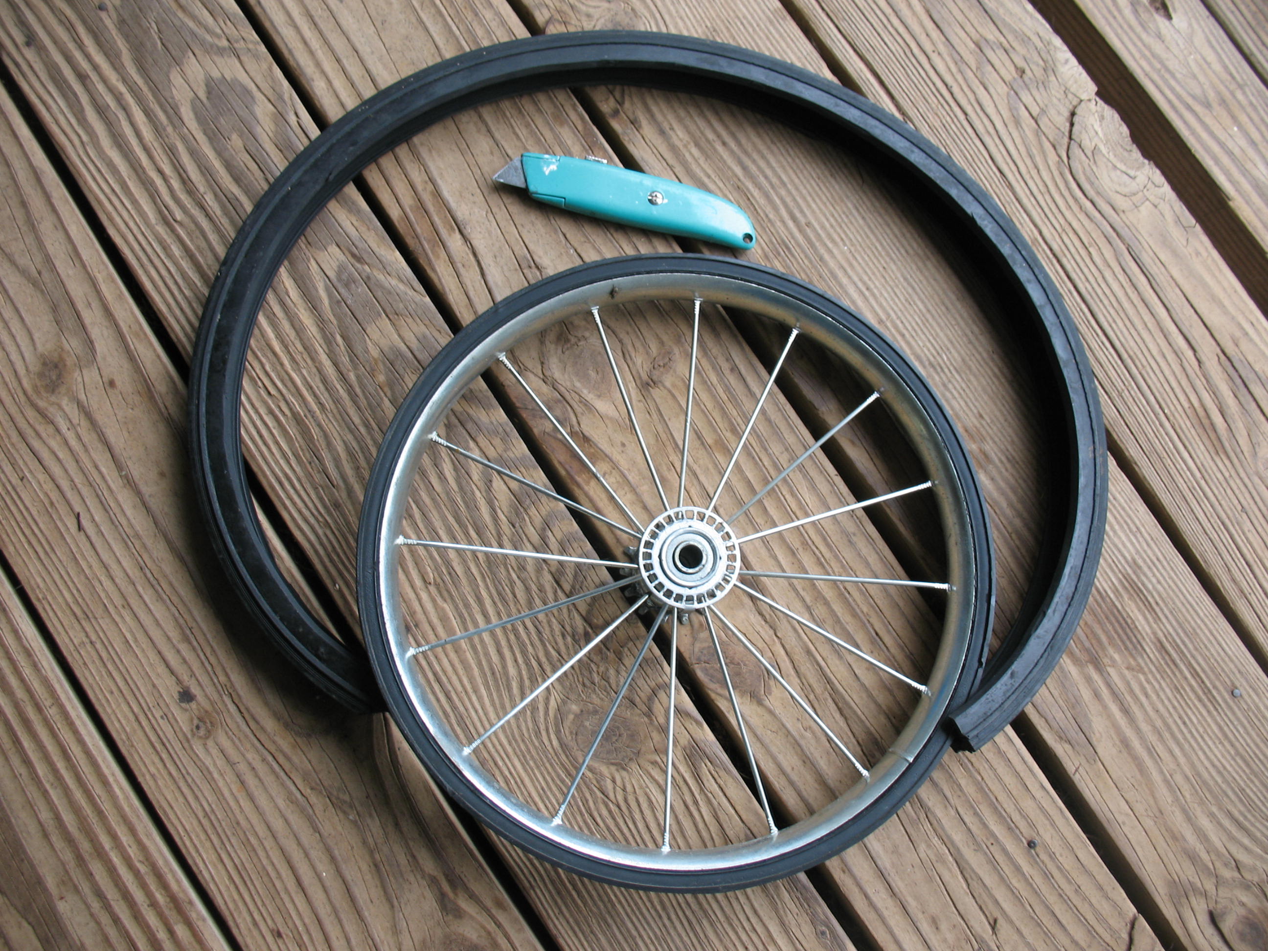 The wheel has a hollow but rigid tire on it.  I was able to use a utility knife and trim off the outer half of the tire.  The inner half of the tire remained firmly fixed on the wheel and since the tire was hollow, it left a nice groove to slip a V-belt around.