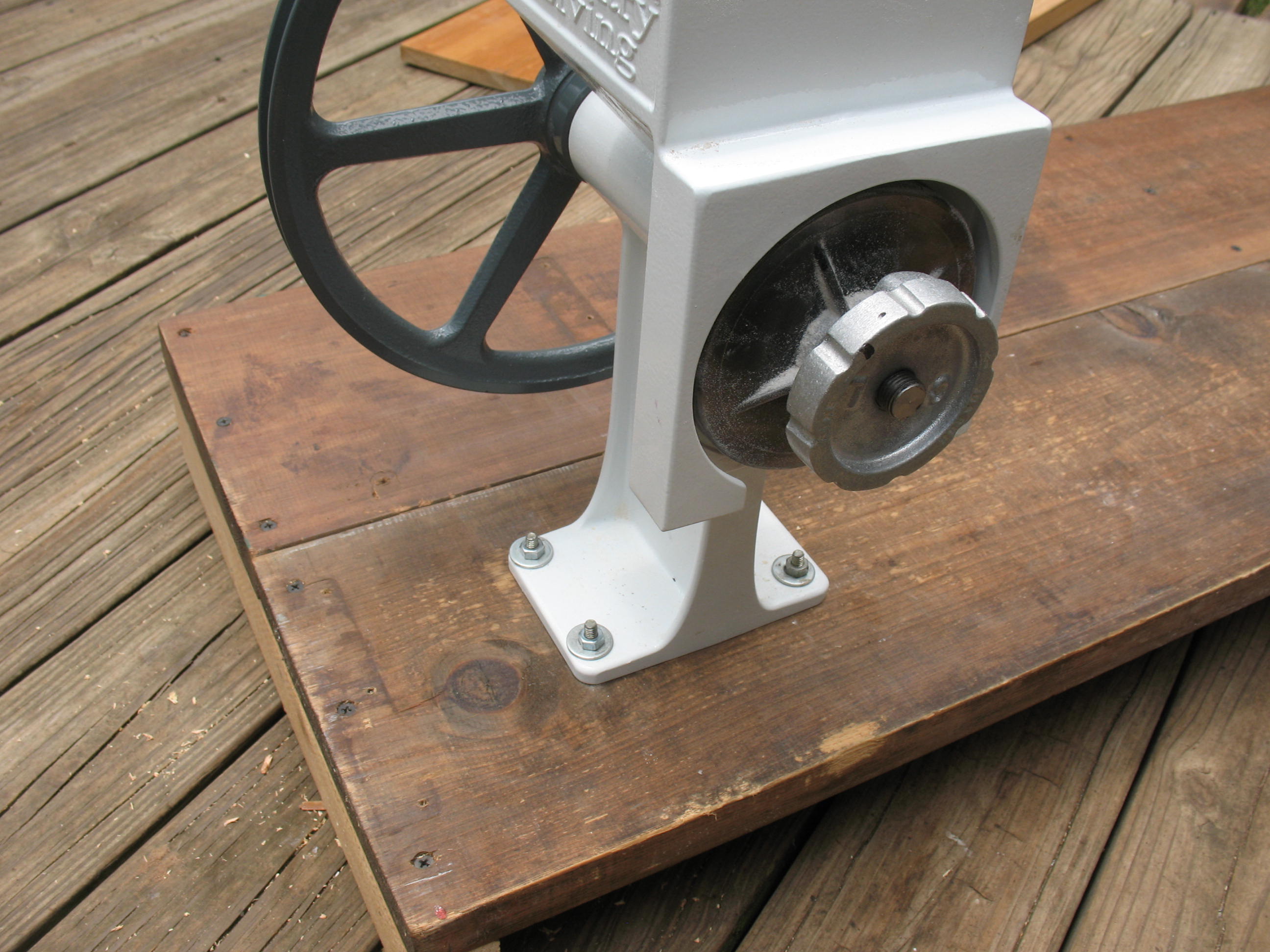 The Country Living mill has a large pulley on it that is already set up for a V-belt, so it would be a simple matter to link the bicycle to the mill once I had them both mounted on some kind of a platform.
