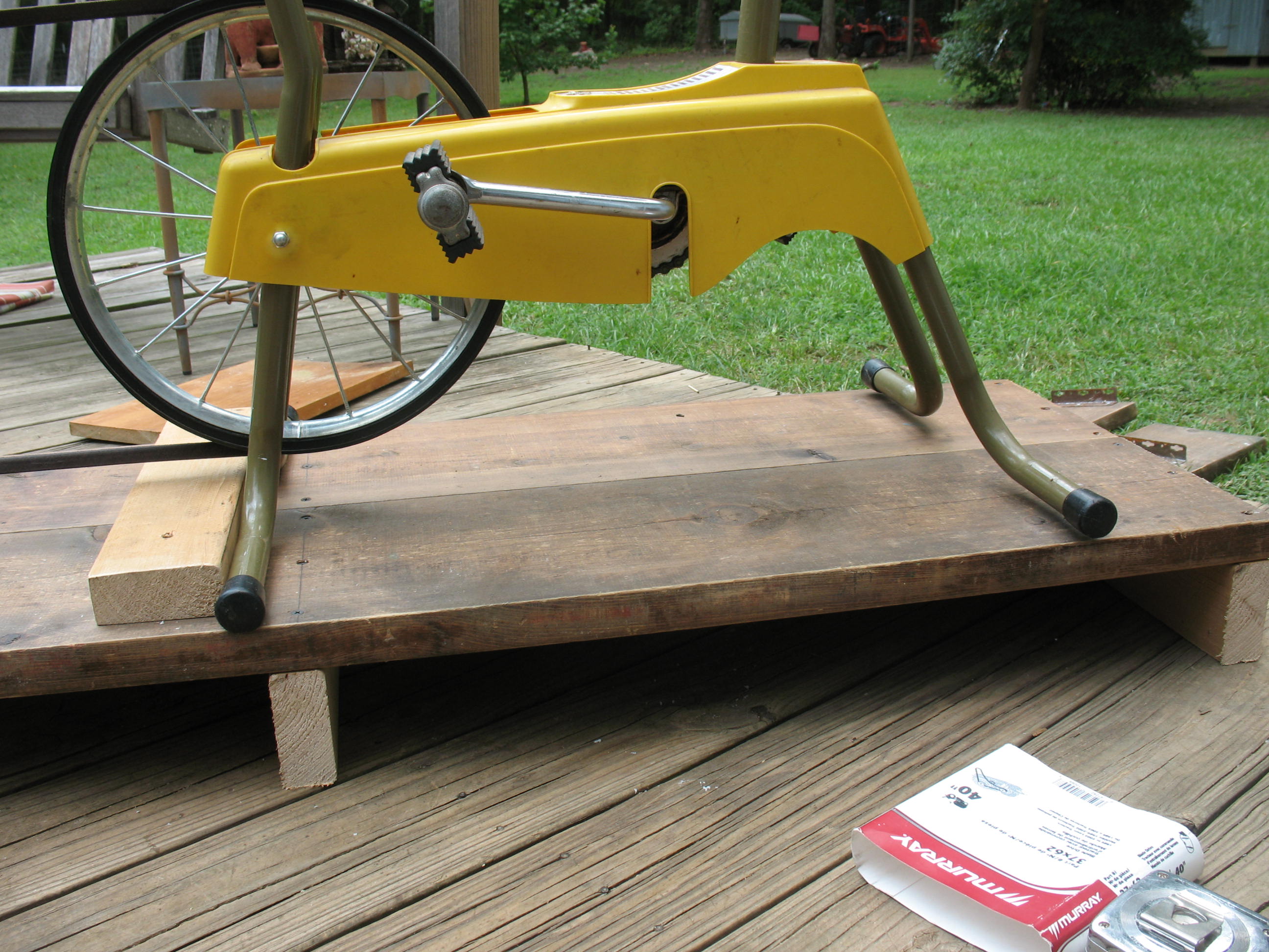 I wanted to mount the bicycle so that it would keep good tension on the V-belt, but I didn’t want it to be so tight that it would cause undue wear on the bearings in the mill.  I decided to nail a board across the platform that would hold the front feet of the exercise bike in place and keep the bike pulled back tight away from the mill.  What I ended up doing was putting the belt on the mill and the bike, laying the loose board across the platform, and then pushing the board (and bike) back as hard as I could by hand, and marking the position of the board.  I then unhooked the belt and moved the bike out of the way.  Now I scooted the loose board 3/8” farther away from the mill than my mark and then screwed the board down.  When I positioned the bike behind the board and reattached the belt, the belt was tight enough that it actually held the back end of the bike about an inch up off of the platform.  When I sat down on the bike it snugged the belt up nice and tight so that when I peddled the bike, the mill hummed right along.  It was not necessary to make any kind of permanent attachments to hold the bike down on the platform.