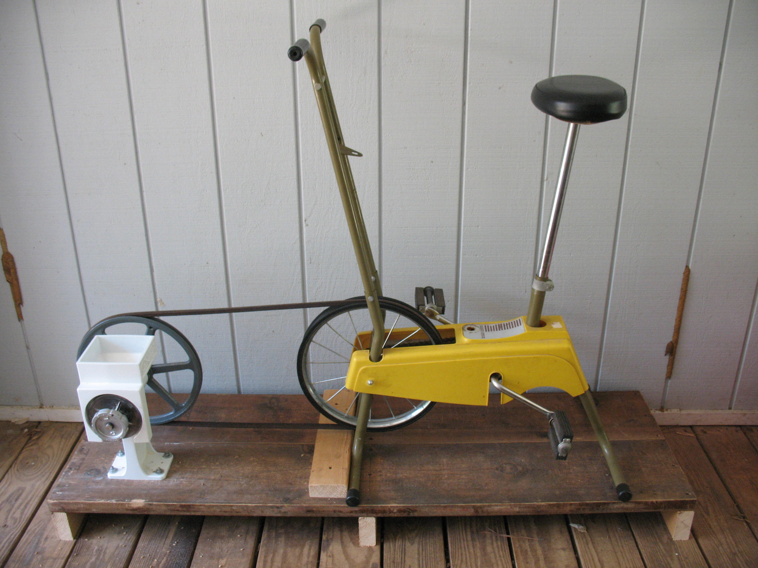 Country Living sells an extension handle that gives you a little bit better mechanical advantage when hand turning the mill, but I decided to skip right past all of that and go straight to peddle power.  I kept my eyes open at the local thrift stores for a few weeks until I came across an old Sears exercise bike.  This is a super basic machine.  Just a seat, handle bars, peddles, and a wheel.  I picked it up for $9.99, and it was perfect for what I needed.