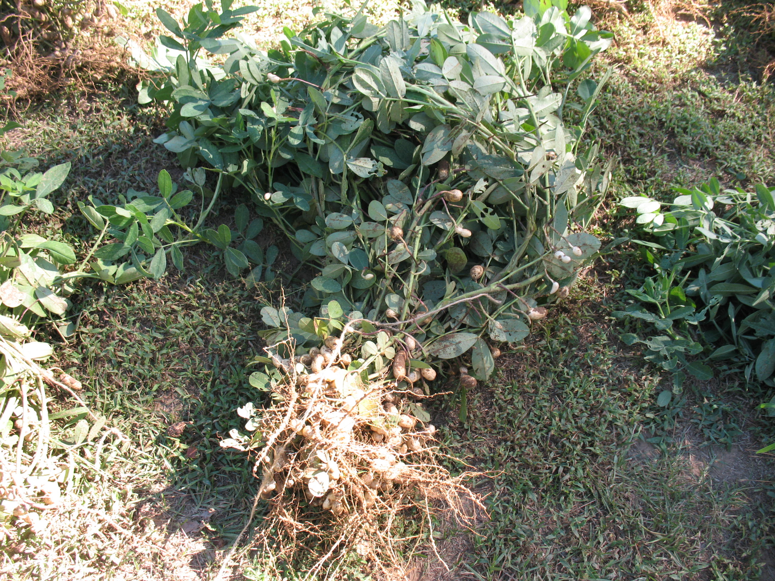 If the ground is too hard, use a fork to loosen it a little; but stay well out from the plant and be careful. Pull the whole plant and don’t remove the peanuts. When you have a bundle of plants about as big around as your arm, use a string to tie them in a bundle (shook).