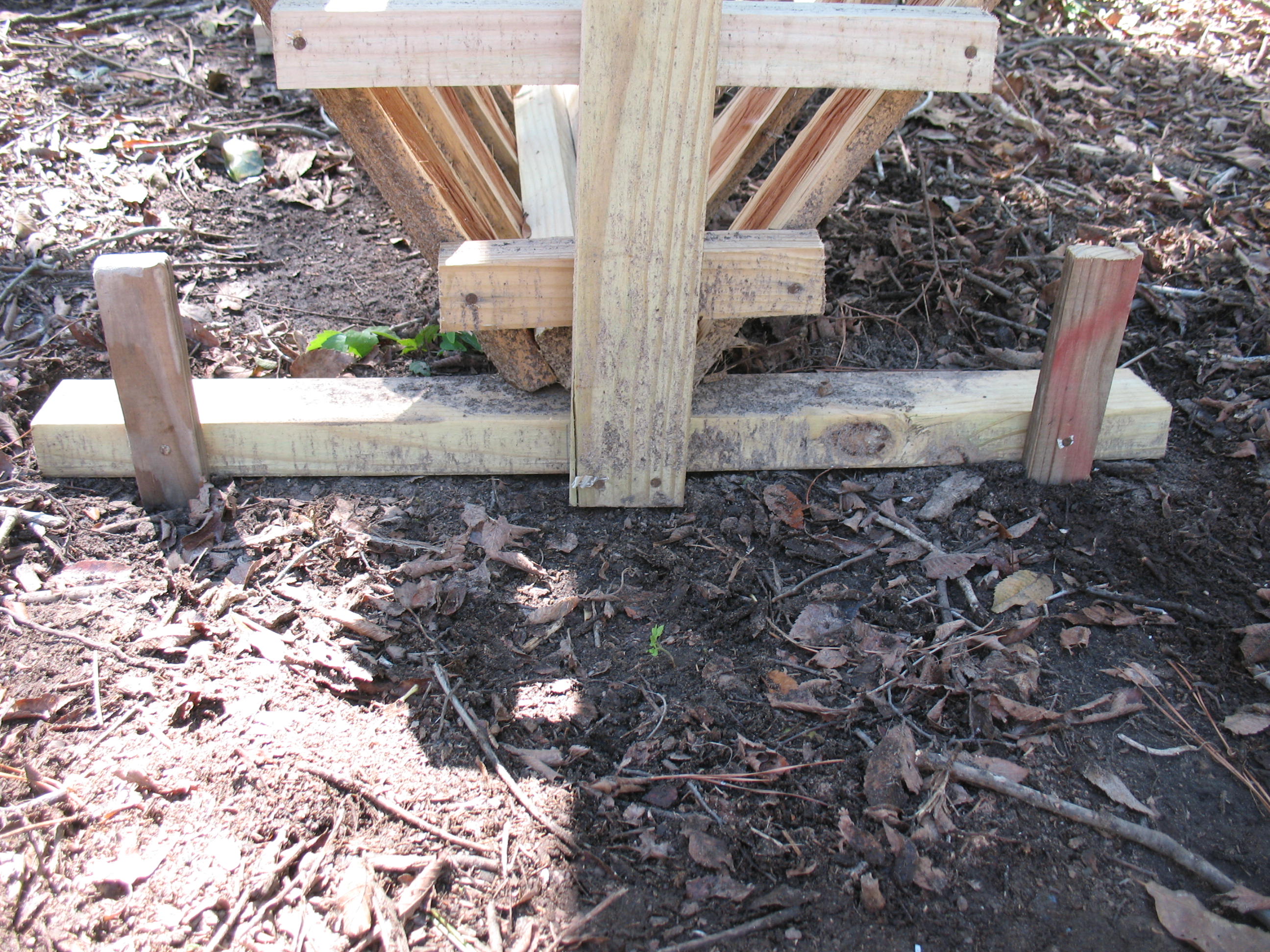 When I moved the manger into the goat pen, I drove four stakes next to the base and nailed the base to them. This is to keep the goats from tipping the manger over.