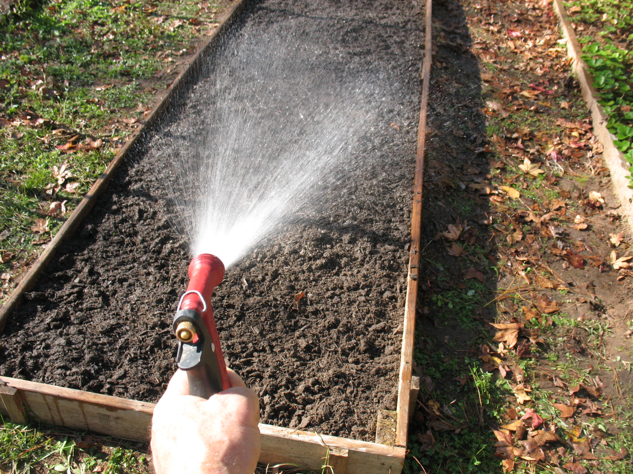 I water the bed thoroughly at this point. Remember, just because you can’t see anything growing doesn’t mean there’s nothing there. Your asparagus still has a massive, living root system down there and it needs regular watering throughout the winter.