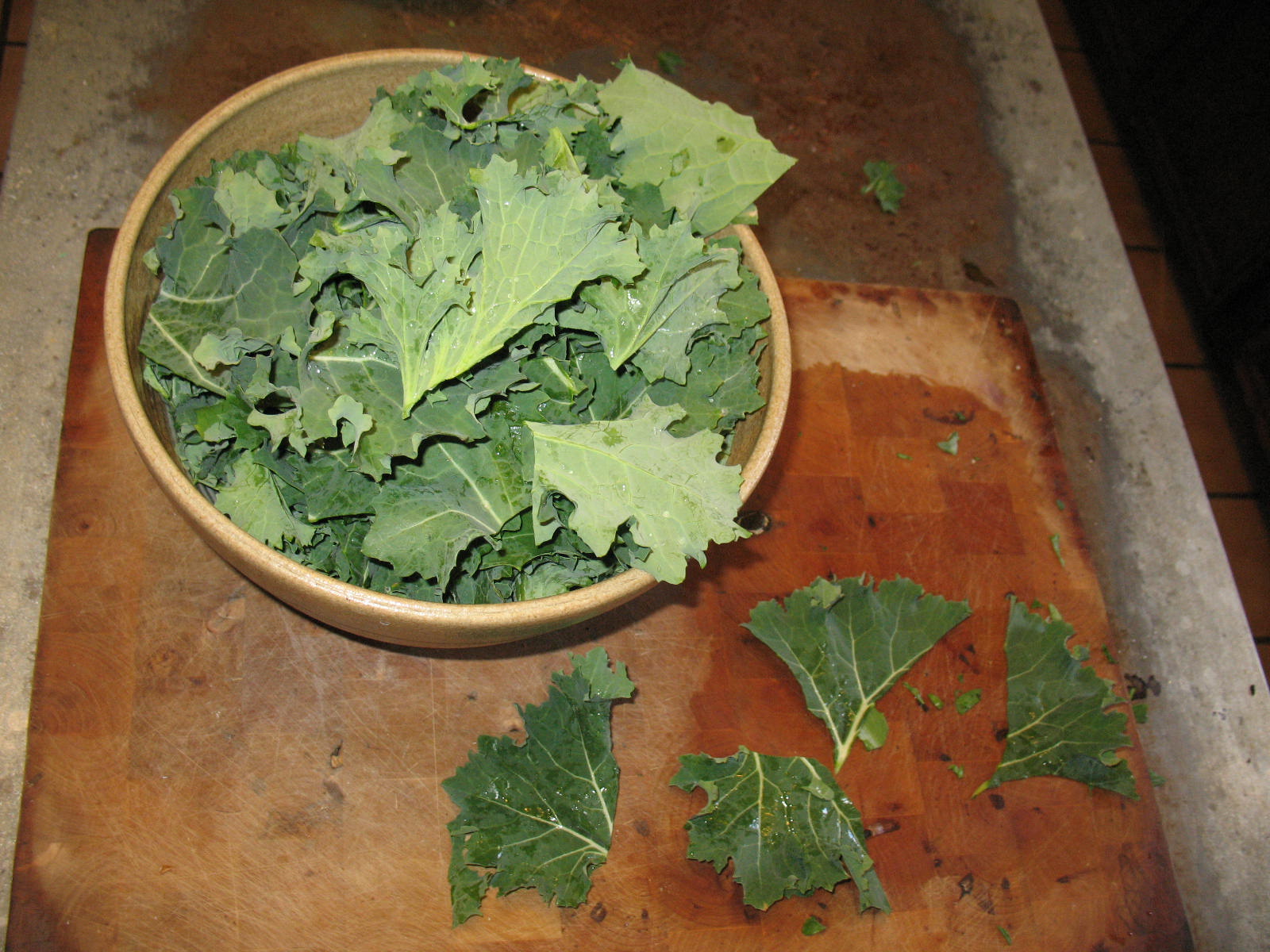 First cut and wash a bunch of kale. Then cut the kale into chunks and place it in a bowl.